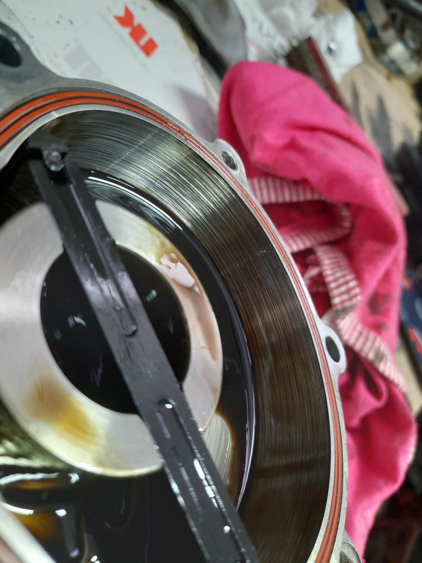 После этого аккуратно, на столе, откручиваем три болта крышки вакуумного насоса и вот что я увидел у себя: