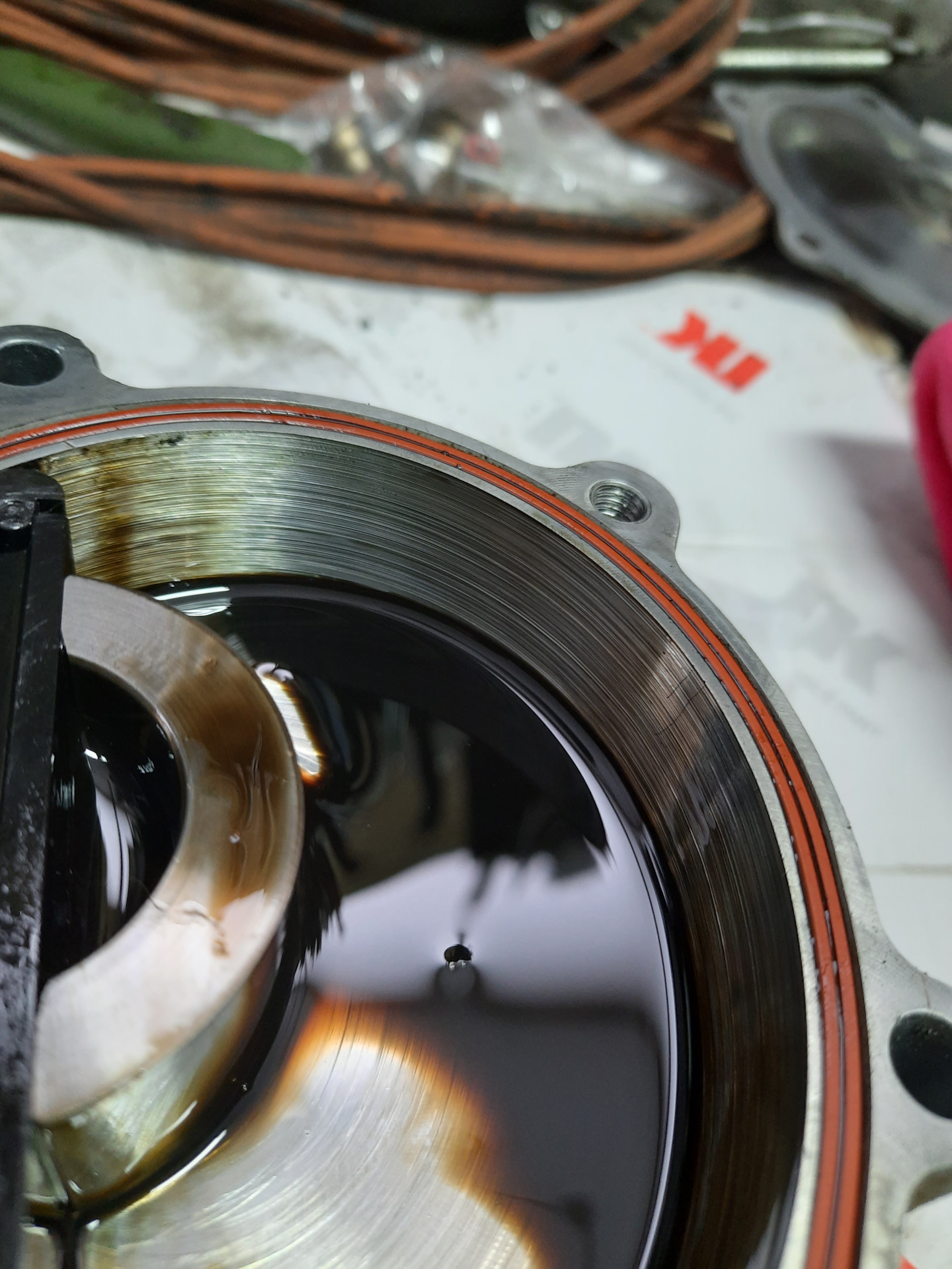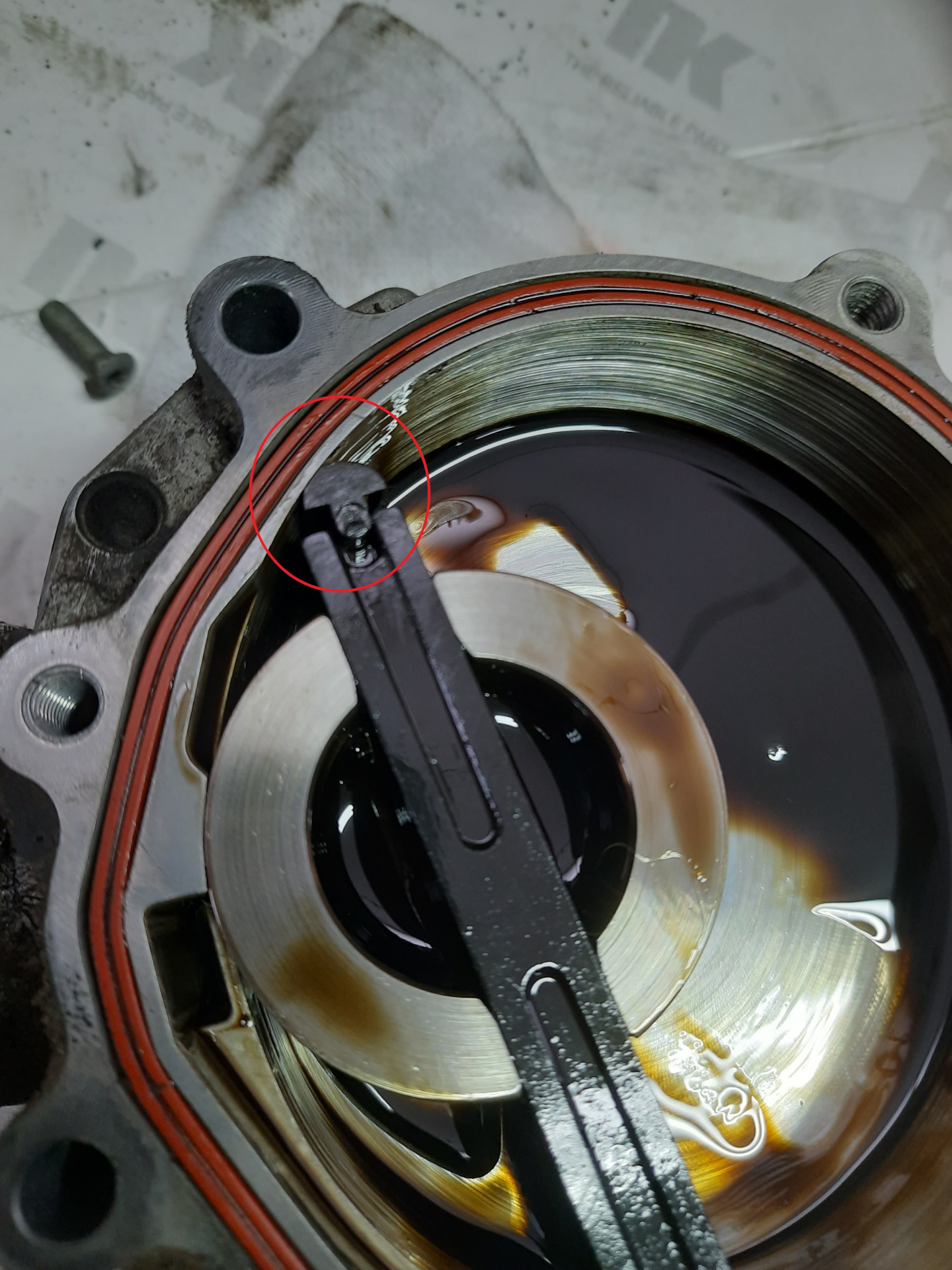 Виден очень сильный износ. На первом фото красным выделил нечто вроде апекса на роторном моторе. Это подвижный элемент, который обеспечивает уплотнение. На фото он в таком состоянии, что его уже легко можно вытащить. Собственно это и случалось в тех случаях — апекс покидал своё место, вставал поперек/хрен-пойми-как и насос клинил. В моём случае — чудо, что я вообще доехал, эксплуатация в таком состоянии запросто приведёт к крупному ремонту.