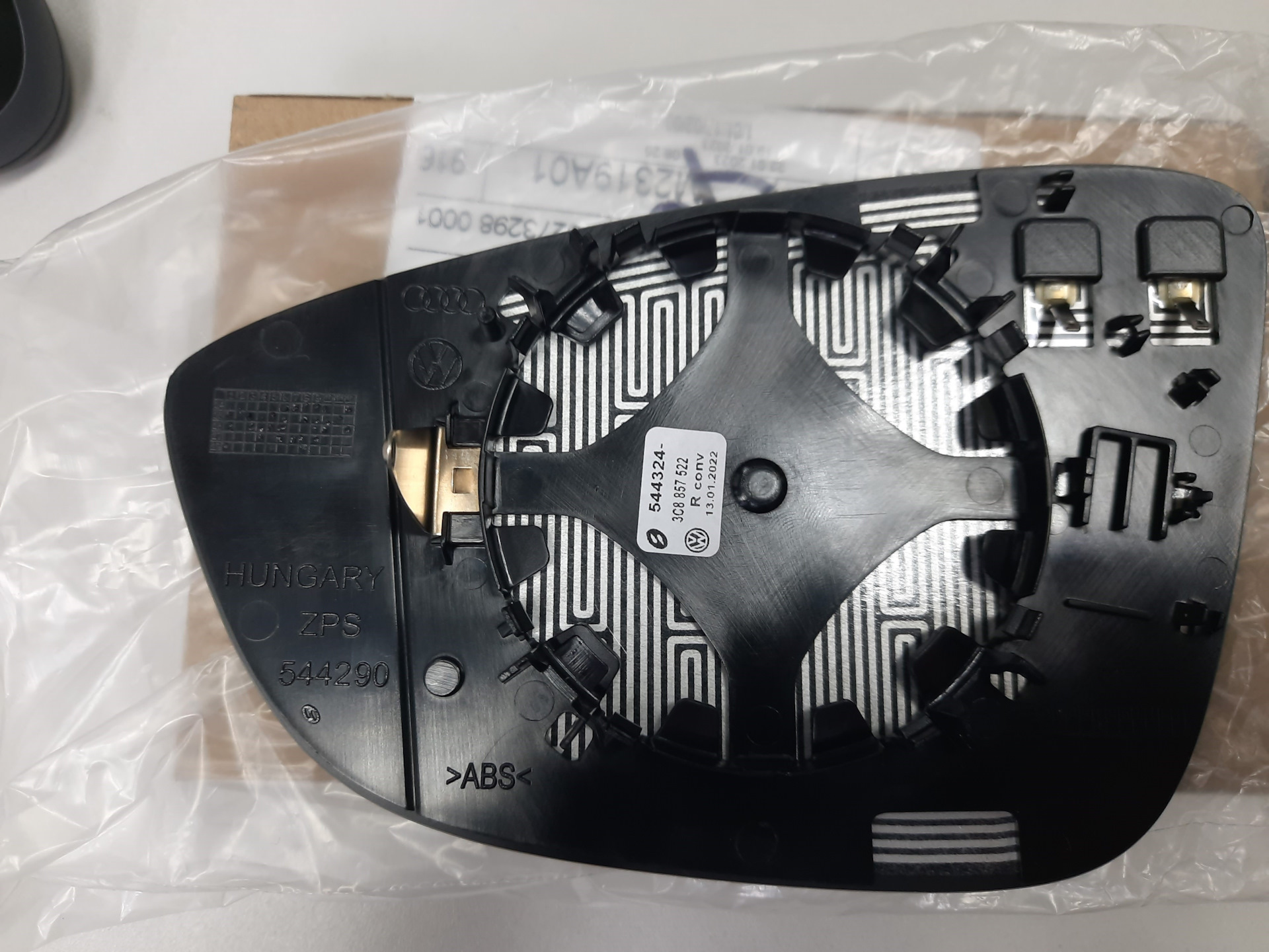 А тем временем родное, уже трижды подклееное зеркало всё еще благополучно ездило, я даже забыл о нем. И вот оно опять отклеилось, не стал снимать и клеить как прежде, просто приклеил к корпусу зеркала на 3 куска изоленты и заказал новое оригинальное VAG 3C8857522: