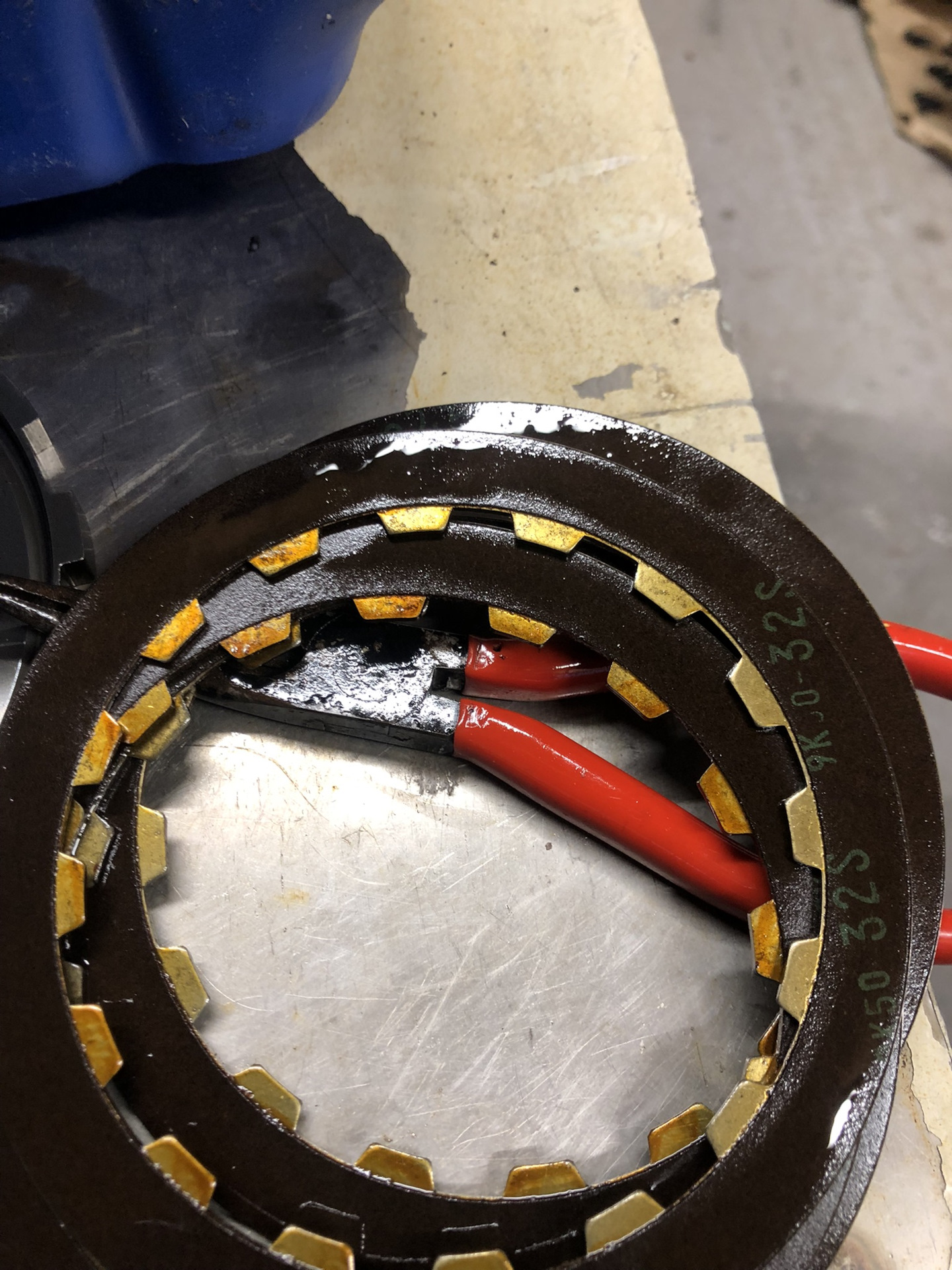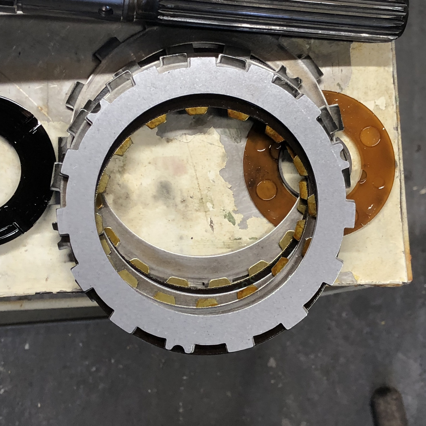 Казалось бы, все идет прекрасно, но нет. На моменте разборки пакета овердрайва обнаружился странный момент — фрикцион (а он один в этом пакете) был зажат не между диском и диском-проставкой, а между диском-проставкой и частью корпуса (крышки?) барабана. Как и когда это получилось? Вопрос хороший, но так быть не должно. Изучил раз 10 мануал по ремонту, каталог крауна и даже позвонил знакомому отца, который занимается ремонтом АКПП многие годы — так точно не должно было быть. И все можно было бы списать на то, что когда-то кто-то сюда залезал и накосячил, но на стальном диске, который зажимается поршнем помимо отсутствия даже мельчайших следов износа была обнаружена деформация по всей плоскости — он оказался вогнут внутрь. И это объясняет то, почему настолько отвратительно машина переключала 3-4 передачи. Моя рабочая теория — заводской дефект, ибо другие варианты не поддаются никакой критике.