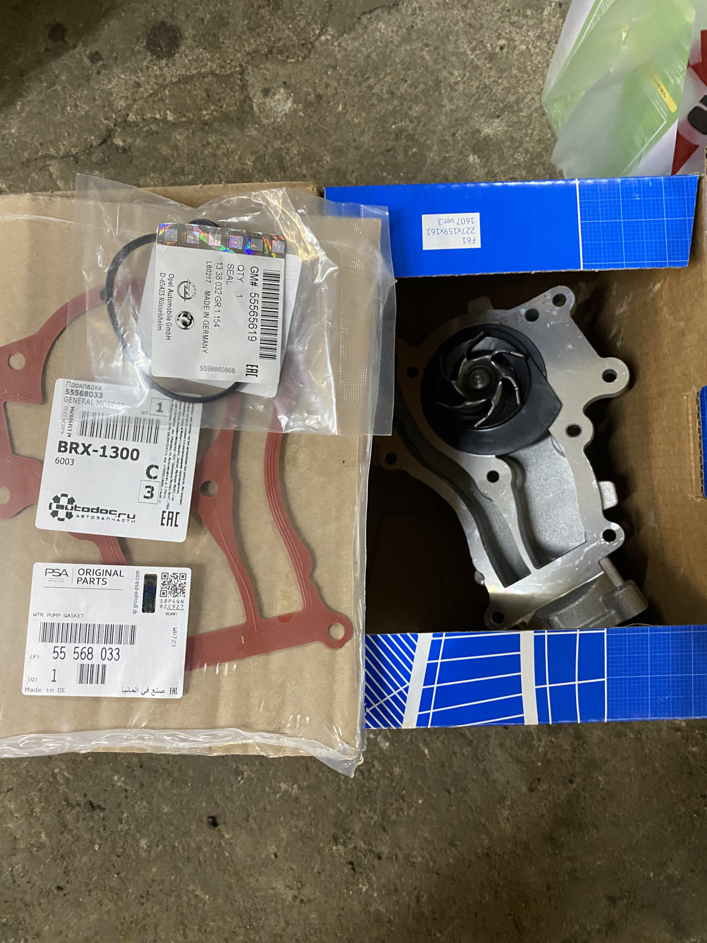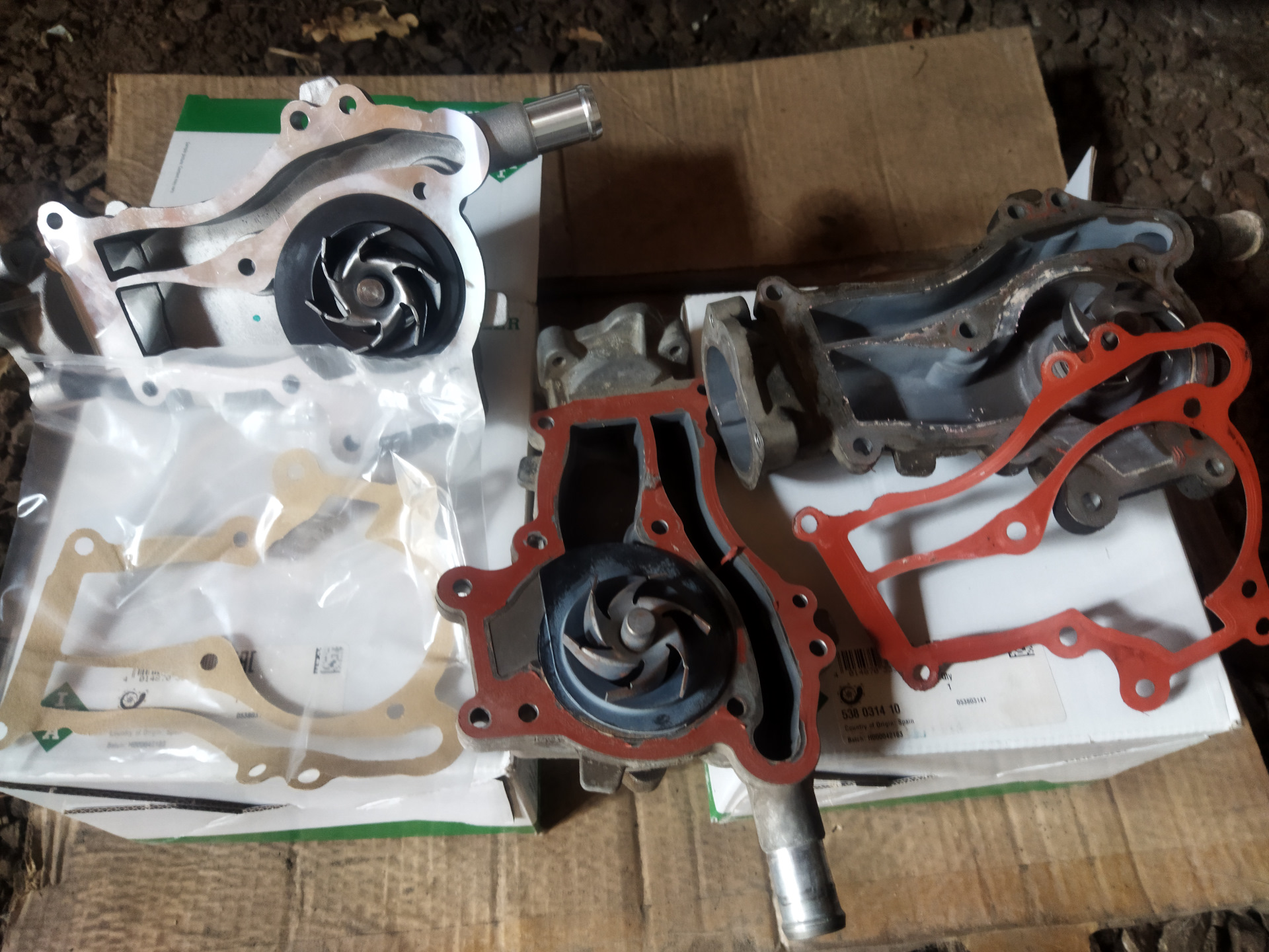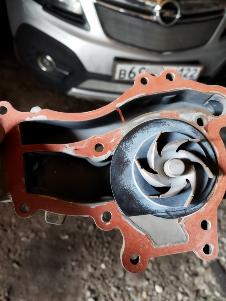 Авто брал новое двигатель А14NET сменил две помпы, новая потекла на 113000т без прокладки металлической была, поставил уже с прокладкой бумажной, когда менял цепь на 210000т купил оригинал прокладку красную метал помпу не стал менять и сменил вторую помпу на 310000т как видно развалилась пластмасса.говорю и показываю как есть.