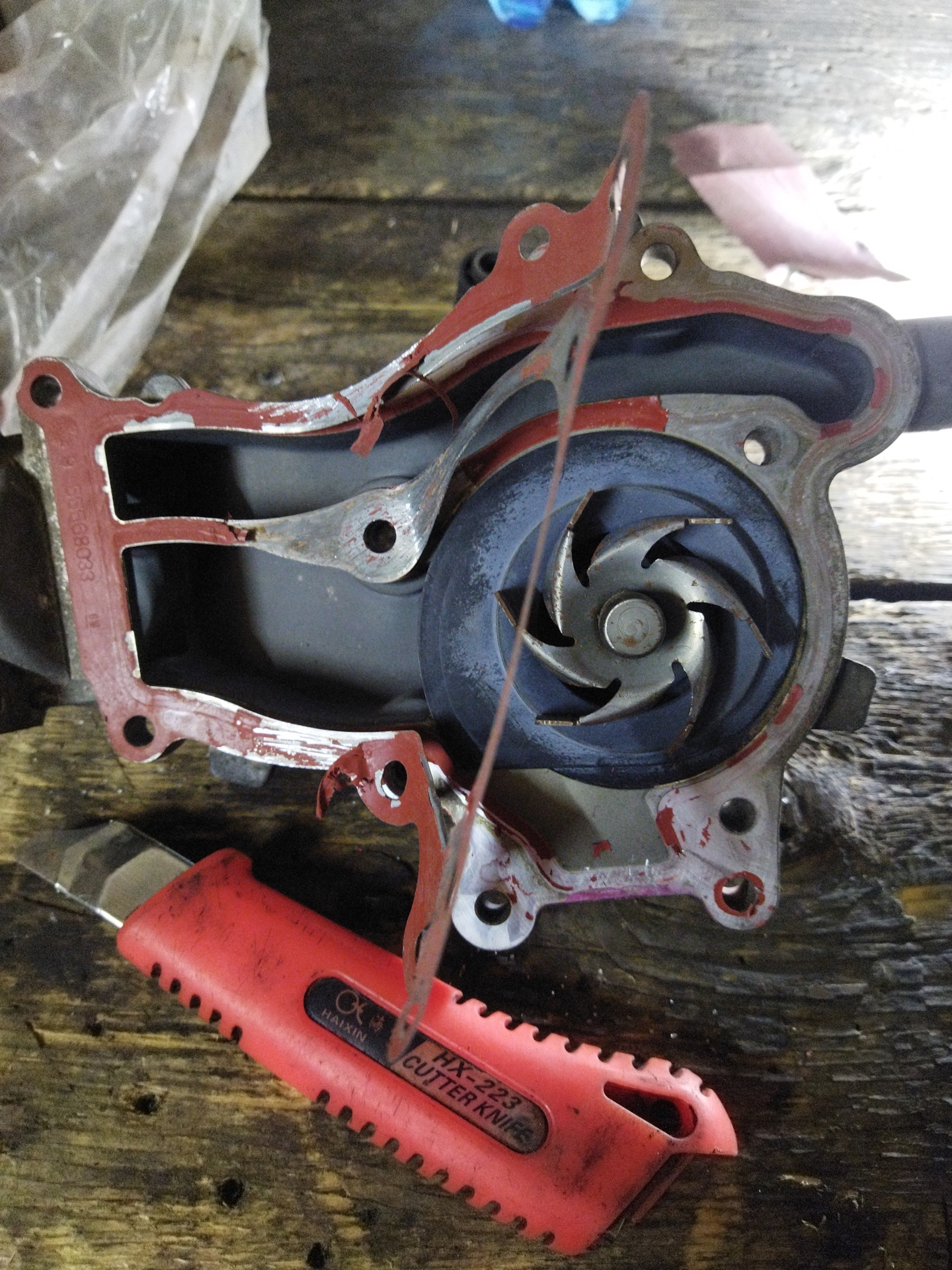 Вы реально не видите, что прокладка на помпе осталась? Вы внимательно посмотрите на вашу же фотографию, специально для вас обвел место, ступеньку совсем не видно?