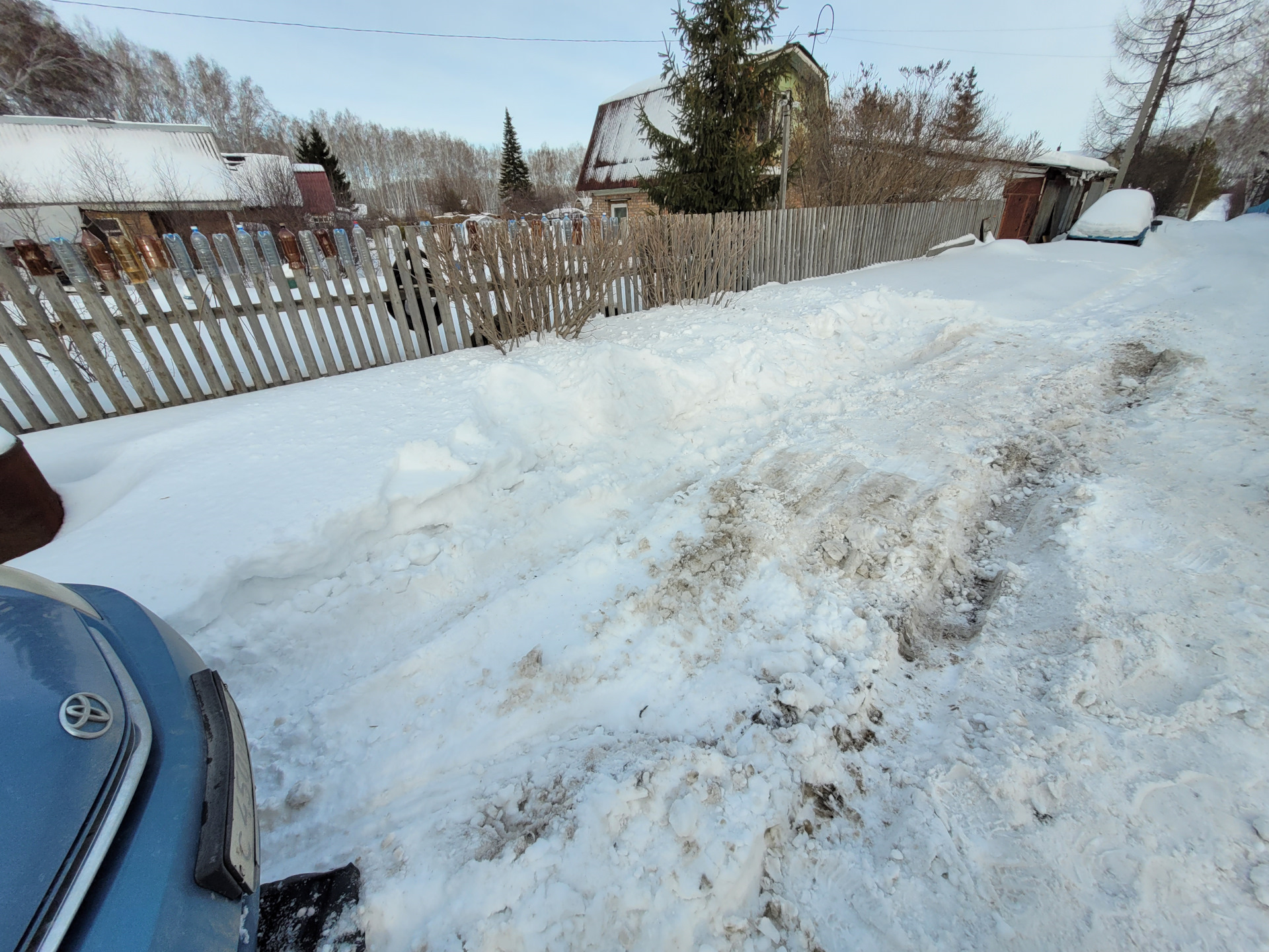 Темнело и холодало. Волевым решением был вызван эвакуатор с лебедкой. Пока ждали эвакуатор чистили путь отступления в 6 рук одной лопатой, чтобы не оторвать бампер (слегка оторвали накладку под бампером до того как поняли что надо отдолбить накатанную колею, с которой Prius съехал, при этом в гараже есть новая оригинальная запасная накладка, будет установлена летом).