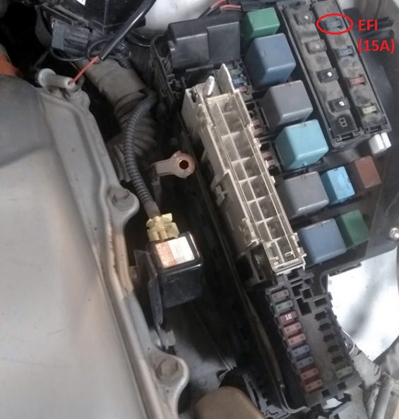 Пока Prius буксовал задним ходом загорелся Check и красный треугольник смерти. Перестал запускаться 1NZ-FXE, электротяга продолжала работать. ELM показал ошибку U0100. Экспресс поиск в сети указывал на выгорание предохранителя EFI (15А справа сверху в блоке предохранителей под капотом). Он действительно сгорел. Замена предохранителя не дала результатов. Батарея окончательно села и перестали переключаться режимы D и R. Включался только режим N.