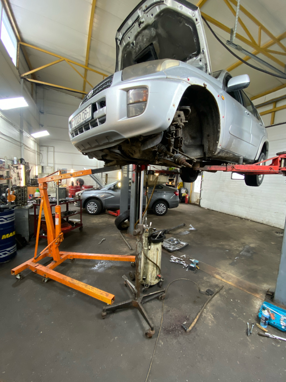 Так как все подушки двигателя сняты, кроме одной правой, двигло надо подвесить как и под кпп упор для извлечения