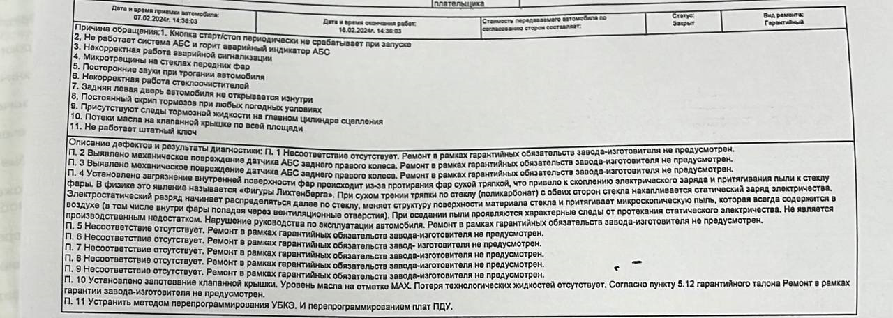 — акт приемы передачи на руки не выдали, как и по прошлым обращениям (со слов юриста, это нарушение т.к. по сути у клиента на руках нет информации об осмотре автомобиля и всех его повреждениях, данный документ только у дилера в одном экземпляре и с моей подписью);