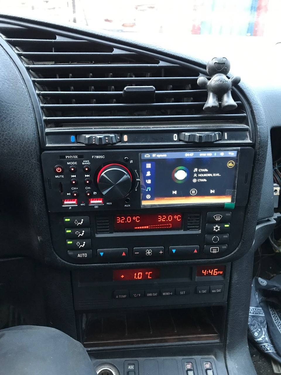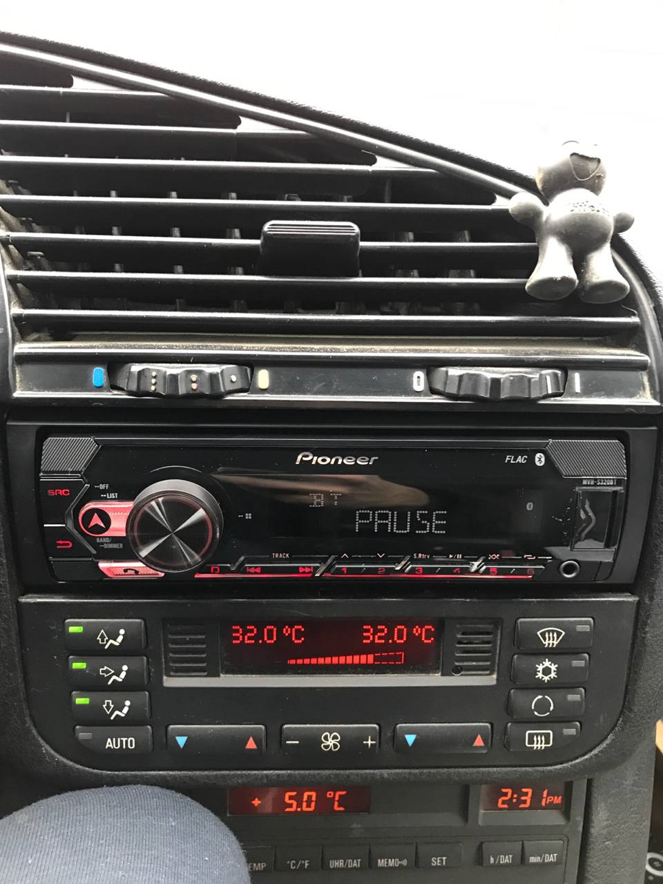 Покупая любую старую бмв, можно быть уверенным, что из нее уже выдернута штатная мультимедия, штатные динамики, и вкорячено что-то дай бог не с али, мне повезло, был установлен pioneer deh-2200ubb и неплохте динамики (правда очень жутко вкорячены). Ну как сказать "установлен" при первом резком трогании с места, она у меня просто вывалилась, что неудивительно — крепления то небыло. Зато штатный коннектор откусан и спаяны (на удивление не скрутка) два униврсальных коннектора, которые подключены к переходнику на pioneer. В нем нет блютуза — печалька. Хотелось бы конечно поставить штатную и впаять блютуз модуль, но штатная стоит 500+ евро в моих краях. Особо не думал взял с али за 40евро, там и с креплением сразу, универсальные коннекторы впаянные уже подходят и в целом симпотичный. Выглядит не очень ужасно, работает неплохо, но звук просто отвратный.
