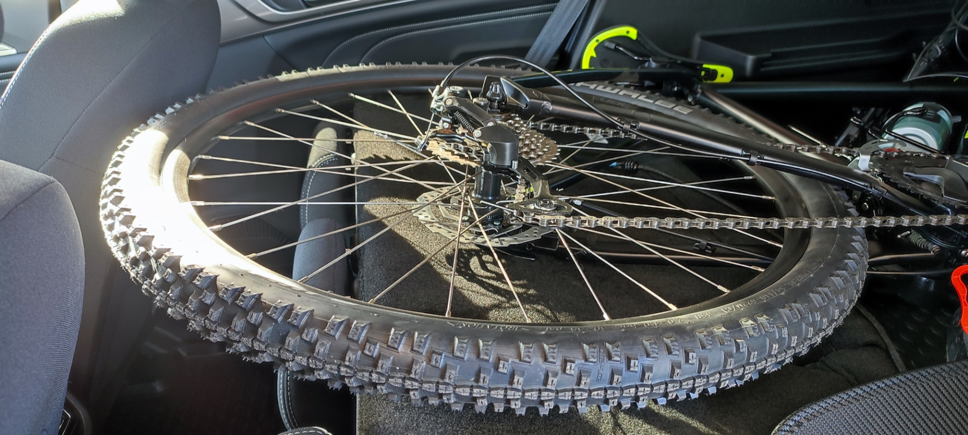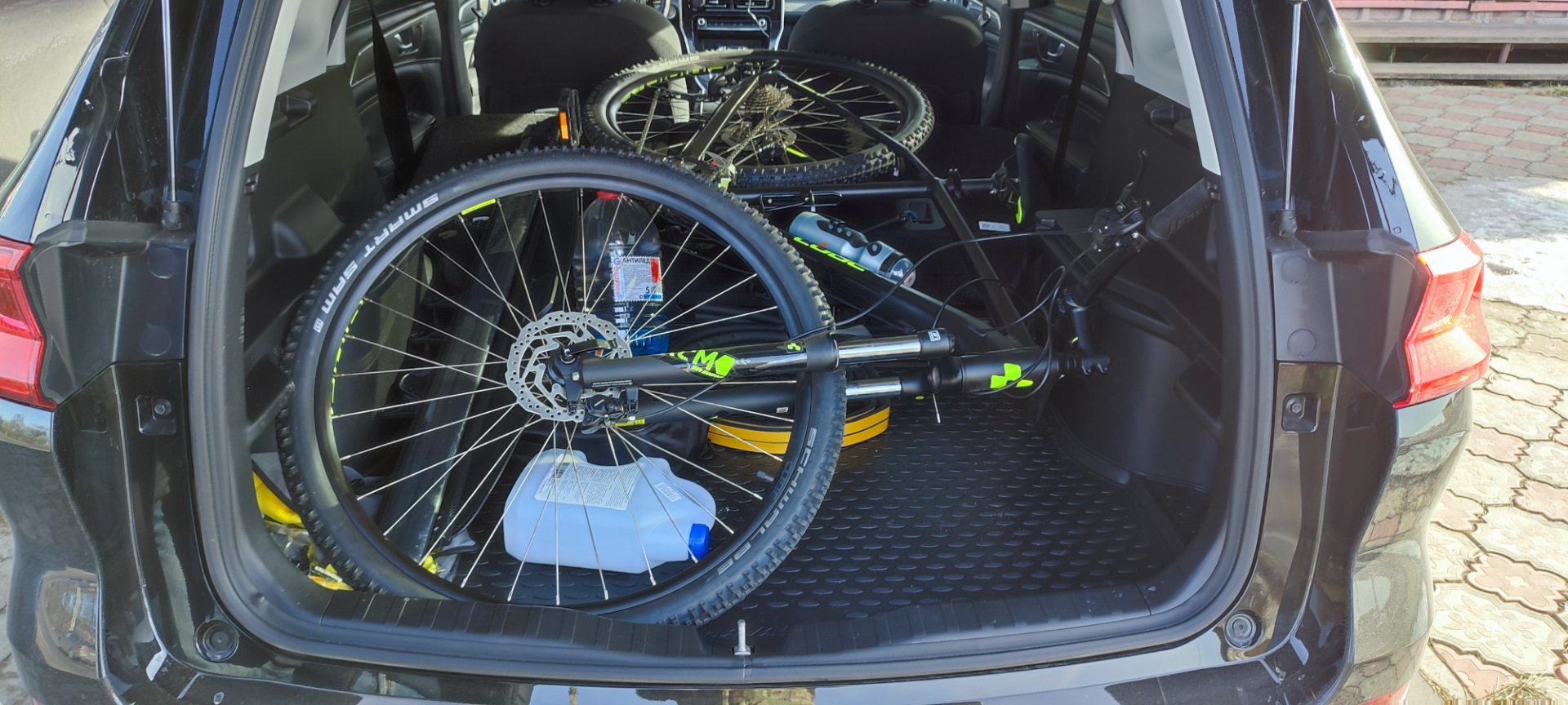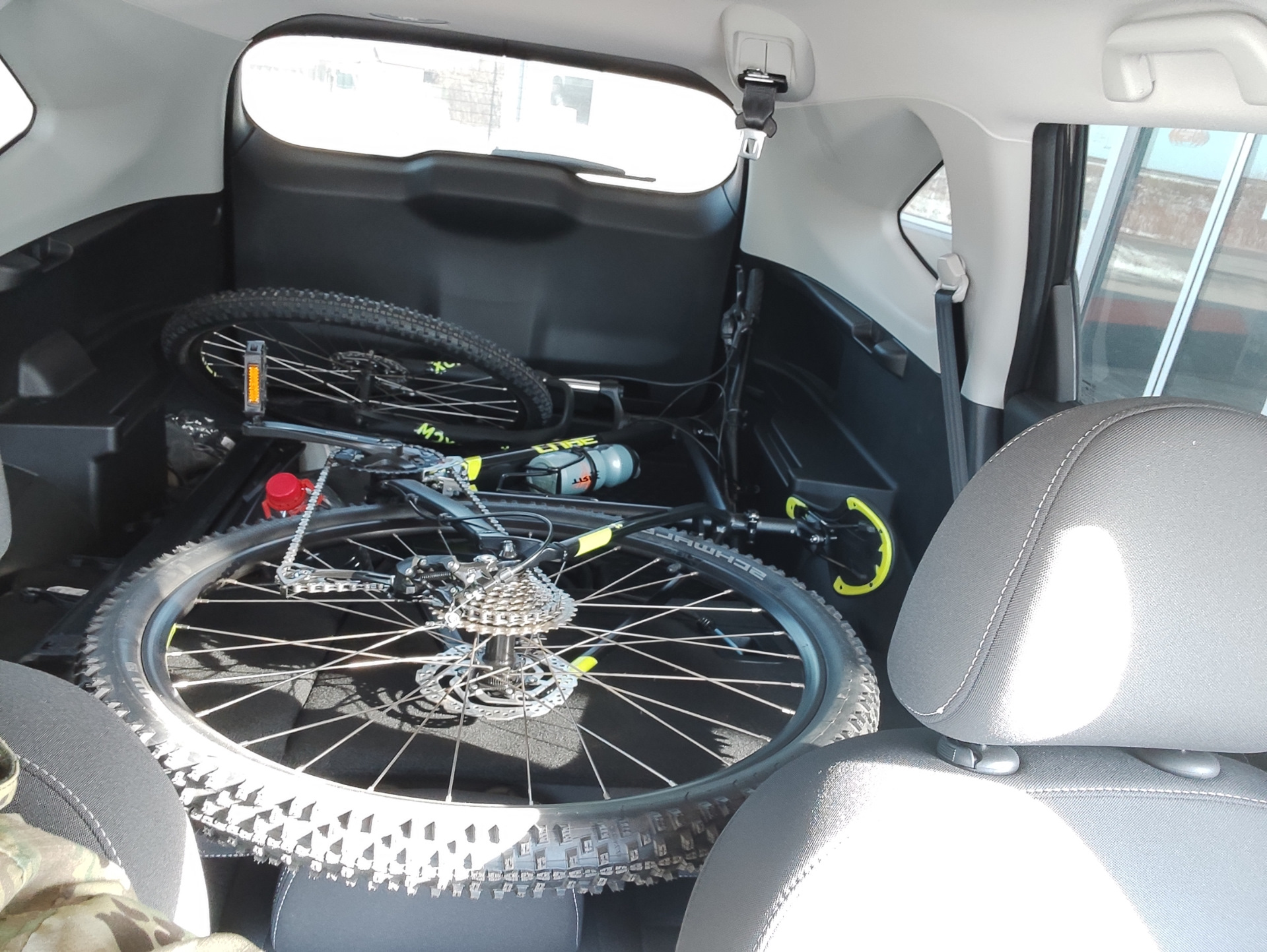 по фото места еще много до потолка. у меня 26 колеса и рама 21. всегда возил лясик в багажнике седана снимая переднее колесо))) вот и обратил внимание на это в планах взять м6 как свое продам