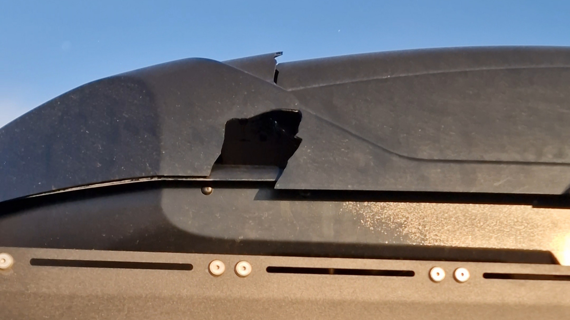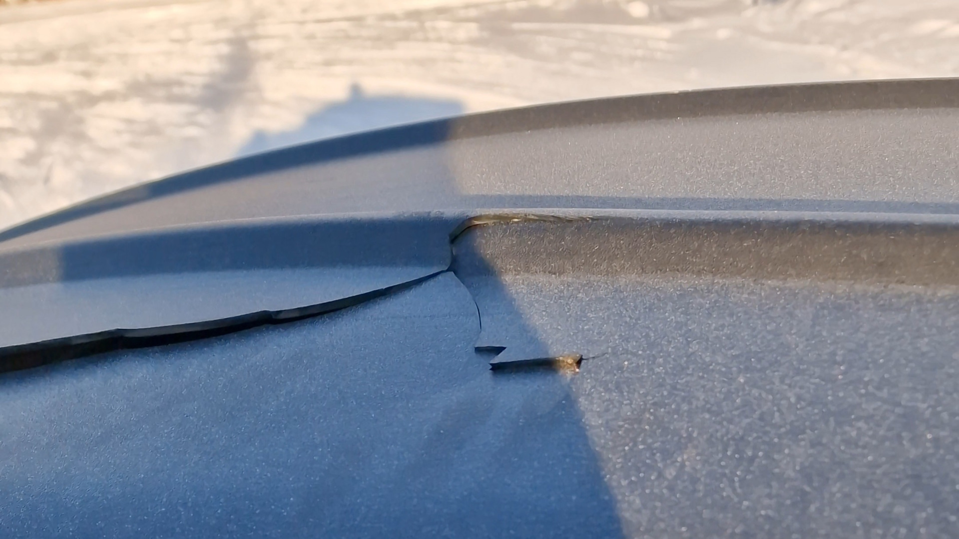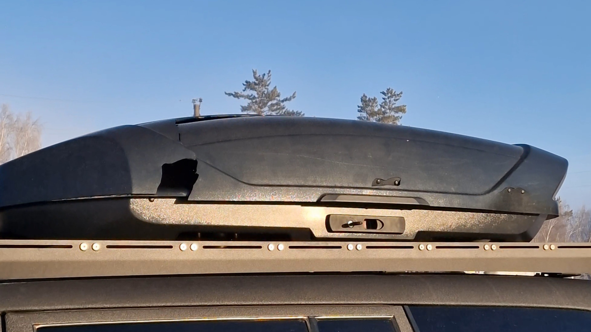 На улице -45⁰С. Начинаю с багажника, забиваю его, полностью за 15 минут, приступаю к загрузке бокса, гружу точно те же самые коробки что и были на пути вперёд, но коробки уже с другим содержимым, не суть, главное что их размер не изменился. Закрываю бокс и придавливаю чтоб защелкнулись замки, надавил от силы 10кг, и он у меня просто треснул весь, как скорлупа яичная, а самое главное треснул именно в месте замков и уже дальше разошлись трещены. Получается проушины уперлись в замки и дальше вместо того чтоб сдвинуть шток замков и защелкнутся, выломались вместе с клепками, в том месте пластик всего 2мм, а может и меньше.