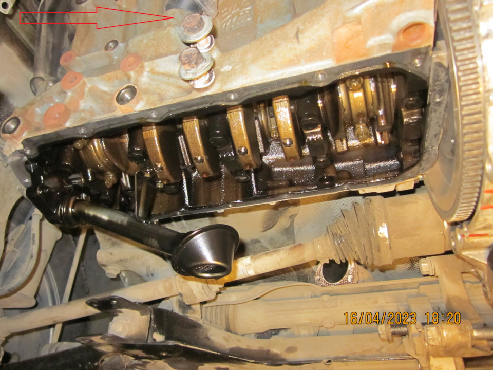А по поводу сапуна, на ВАЗ21179 забор картерных газов организован из блока в зоне возле противовеса на 2-ом цилиндре (отметил красным). Белая хрень внутри отверстия — это полиэтилен, которым закрыл отверстие от попадания пыли.