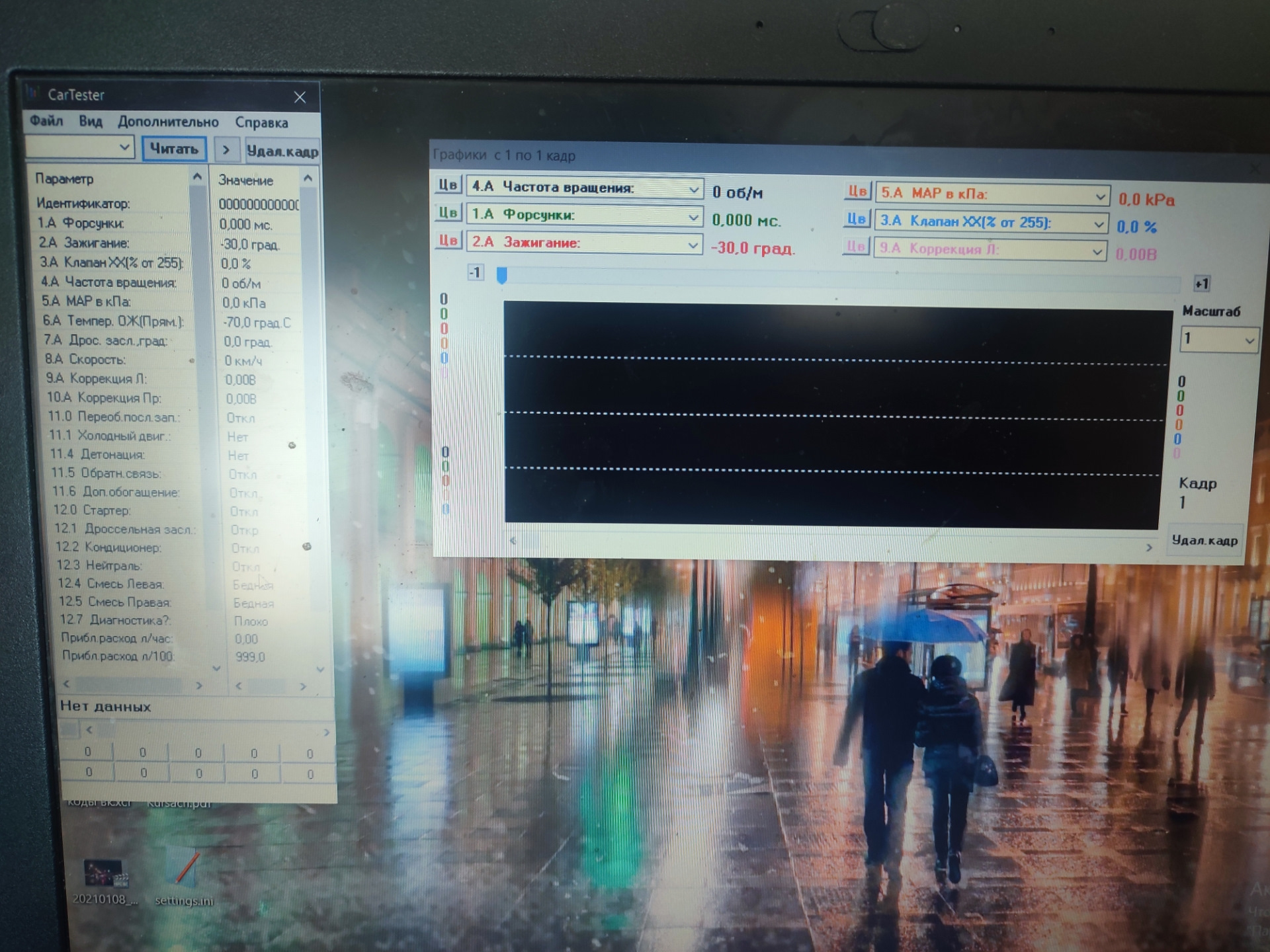 Слева от кнопки "Читать" выбираем в окошке нужный COM порт. И нажимаем читать. Включаем зажигание и всё, все показания на табло. Можно их вывести в график, только вот частота считывания хромает, где-то 1 запись в секунду — полторы. В принципе этого должно хватить.