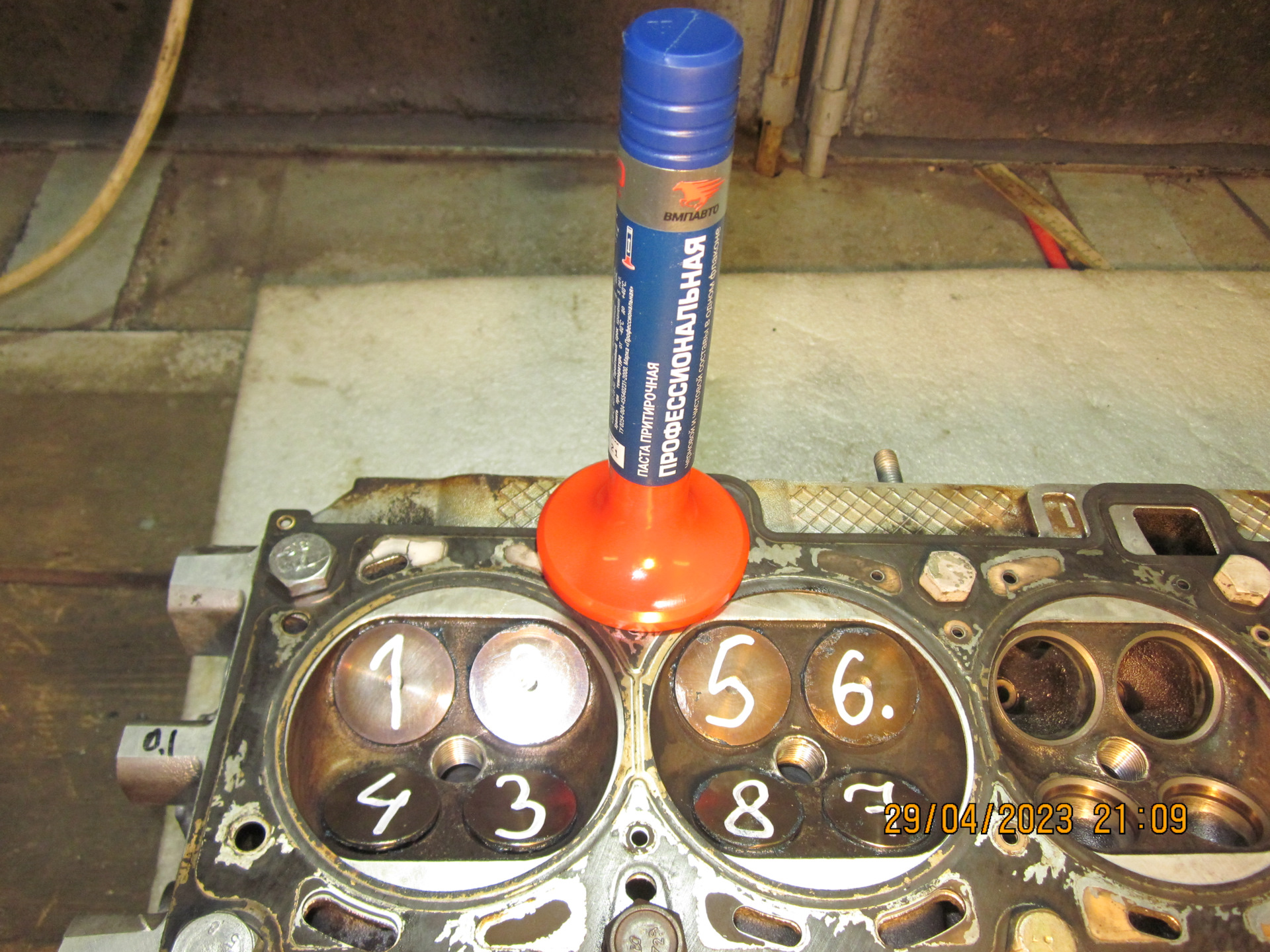 Защитил от повреждения привалочную плоскость старой прокладкой и занялся притиркой клапанов. В качестве технологических пружин подошли пружины из ГАЗ-овского ремкомплекта. Притирочную пасту взял ВМП из наличия, в работе понравилась. Притирал, прижимая дрелью к тарелке клапана обточенный шинный сосок для бескамерных шин, дёшево и сердито.
