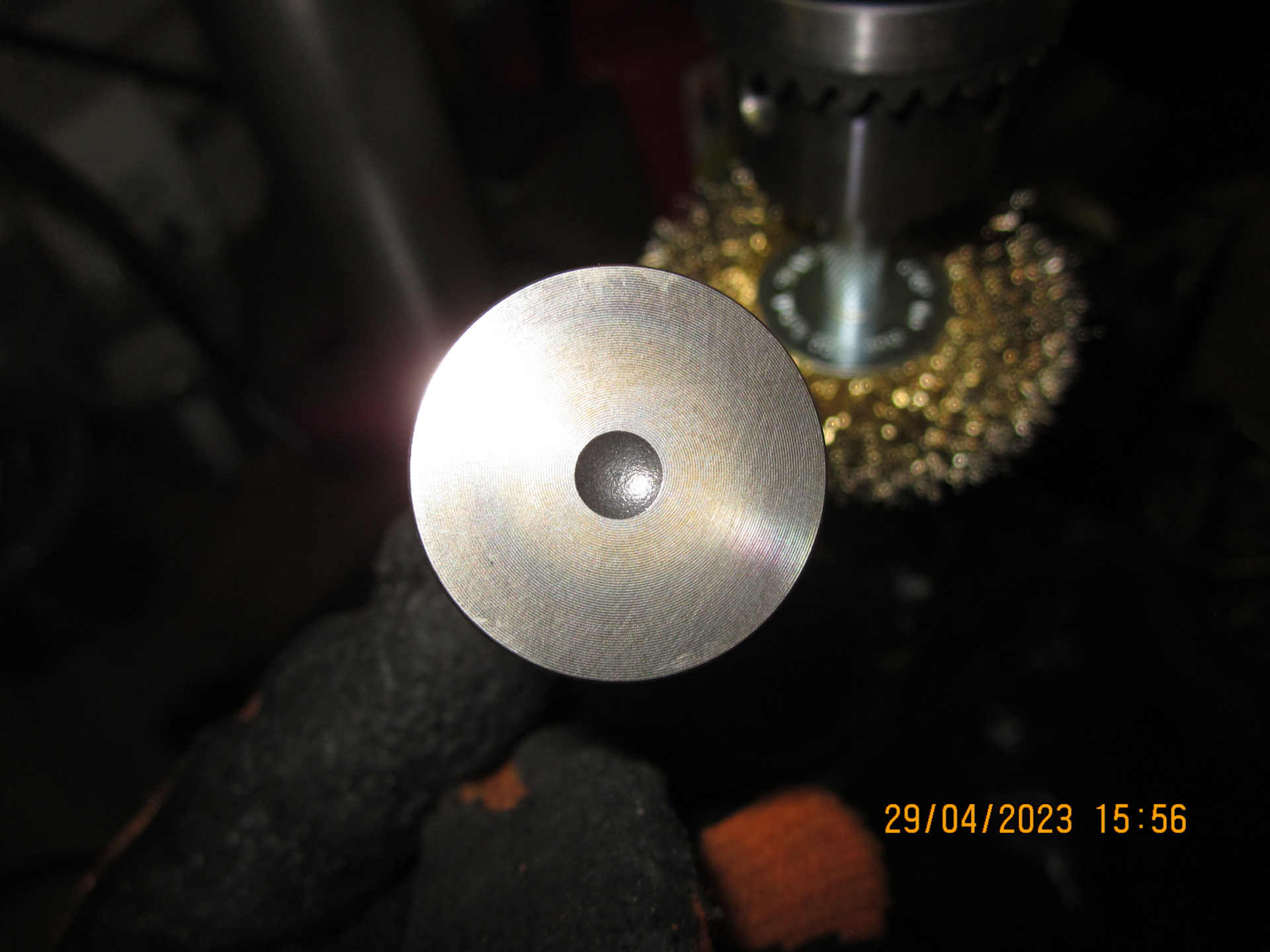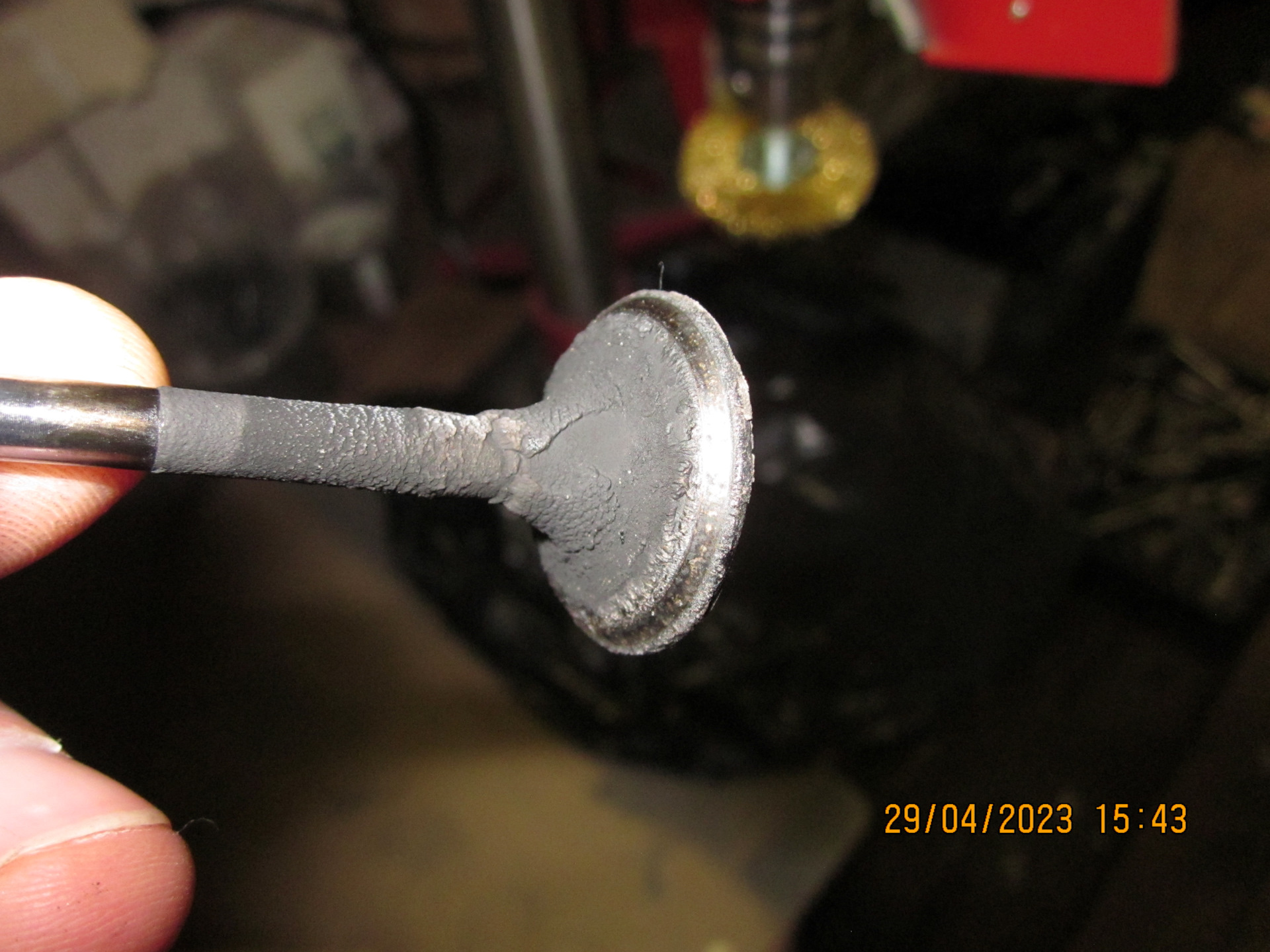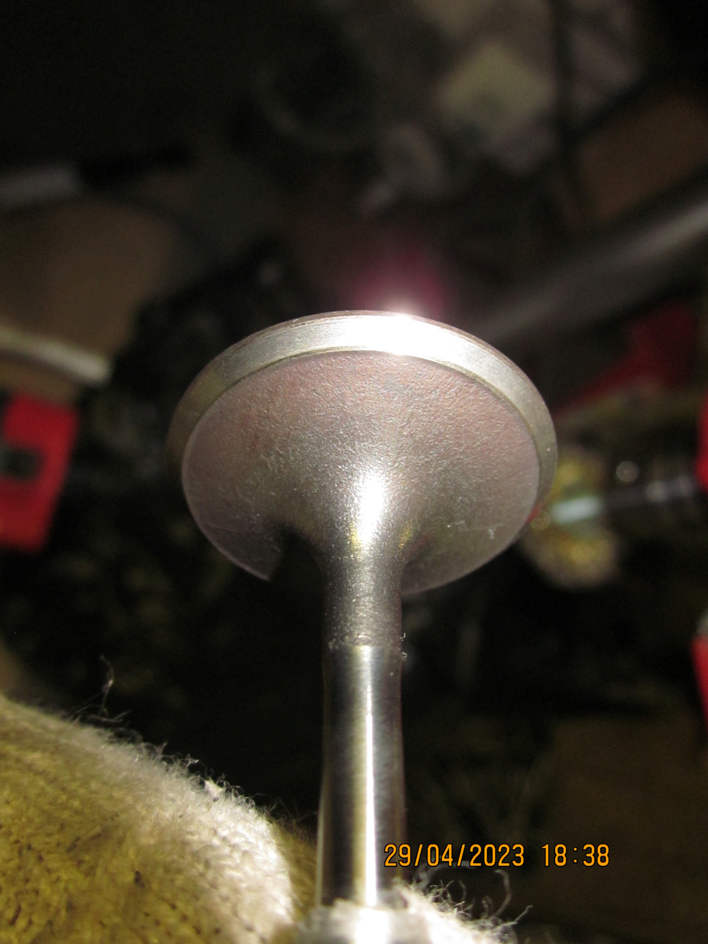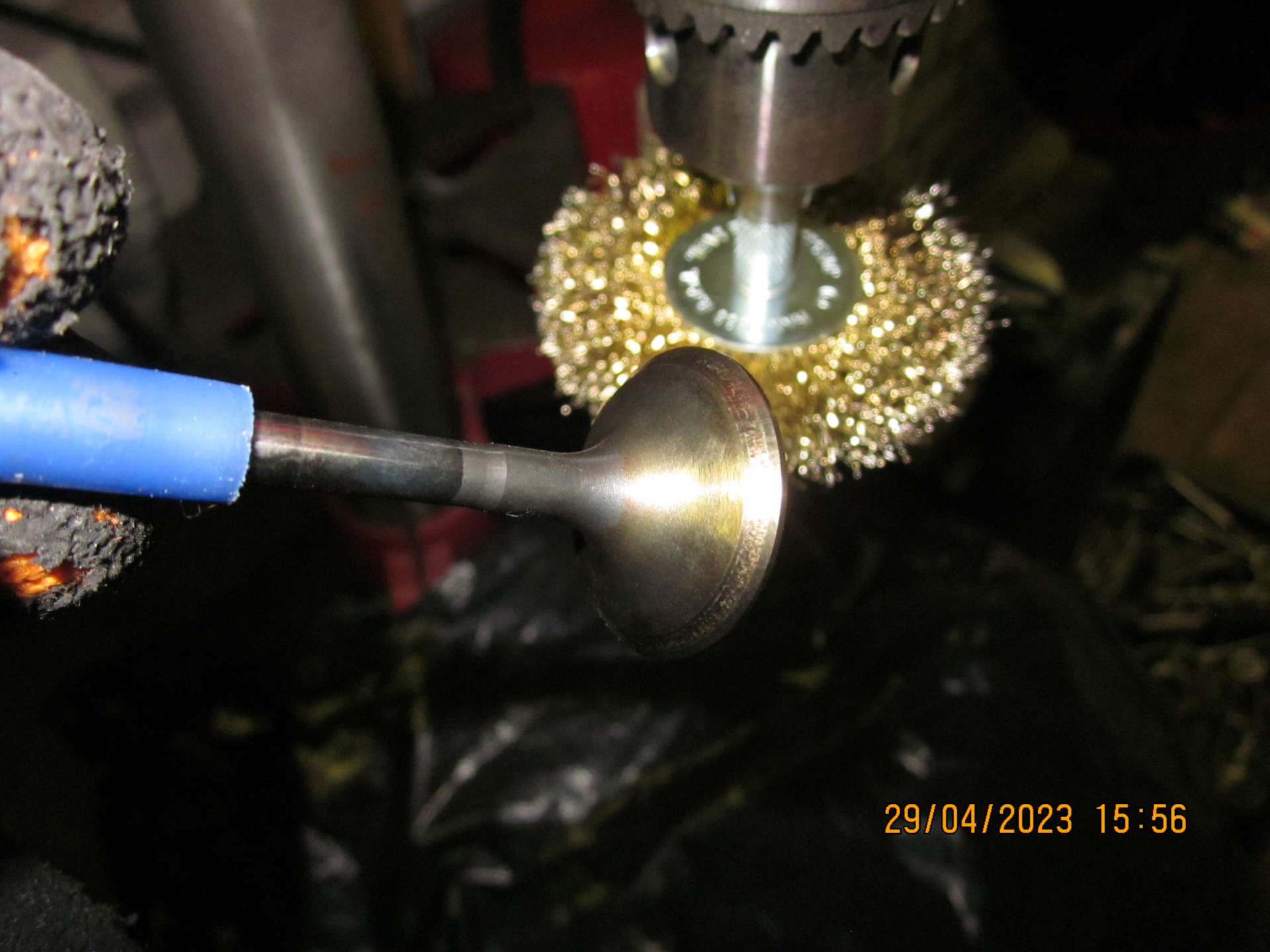 Следующая трудность – очистка клапанов от нагара и зольных отложений. Ну, со впускными клапанами я управился относительно быстро и без особых усилий. А вот зольные отложения на выпускных клапанах по твёрдости были сопоставимы с красным кирпичом!.. Походу надо было лить (и доливать, доливать, доливать…) малозольное масло… Очистку клапанов производил посредством дисковой щётки для дрели, зажал её в сверлильный станок, выставил максимальные обороты, а клапаны через кембрик (чтоб не покоцать стержни) зажимал в шуруповёрт и вертел относительно вращающейся же щётки. Получалось относительно быстро и гуманно по отношению к клапанам.