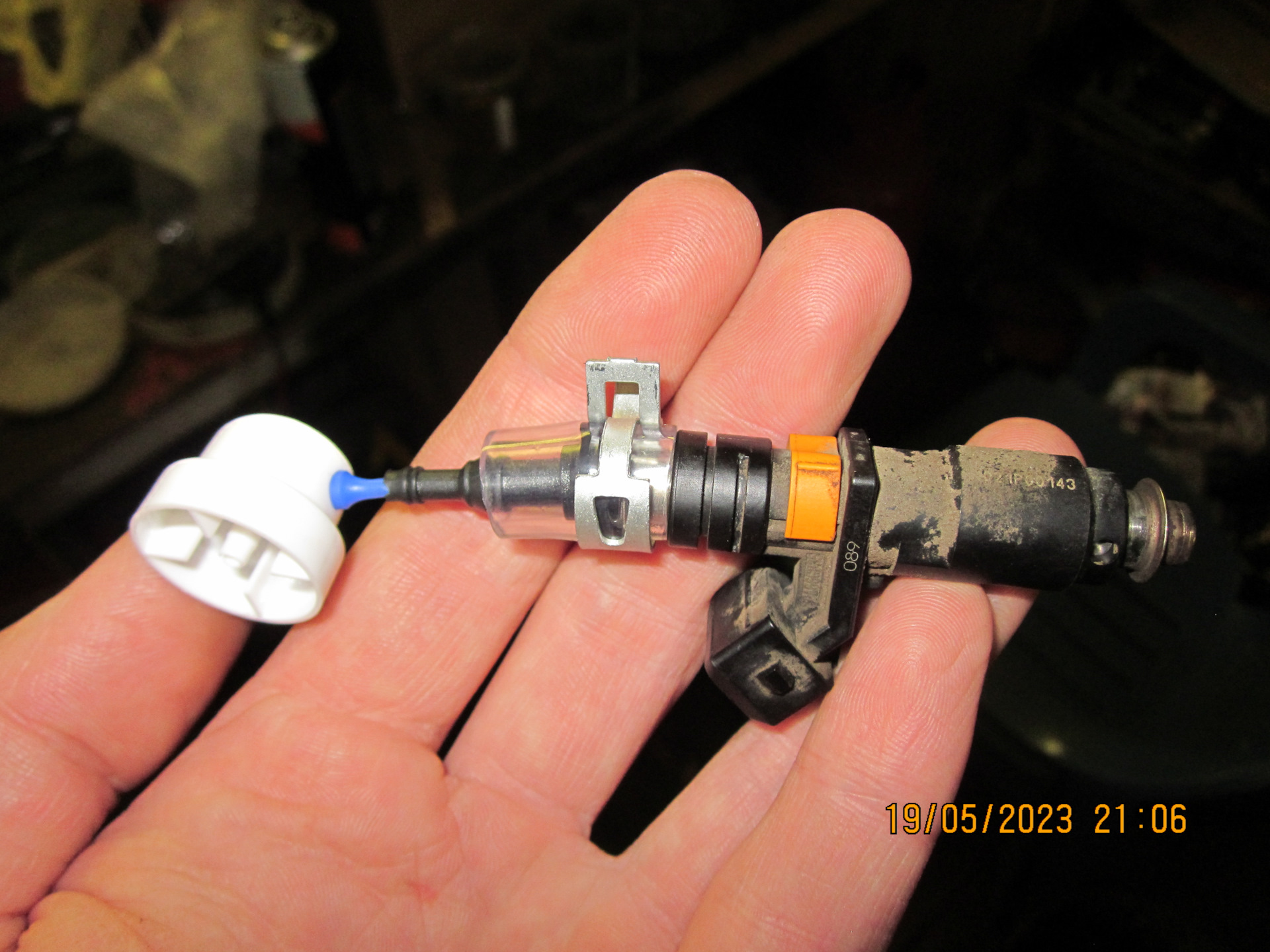 Топливные форсунки хотел было отдать в сервис, чтоб их там промыли спец-составом на спец-оборудовании. Но услышав цену, решил что усрусь, но промою их сам. Сделал самодельную оснастку из говна и палок пластикового штуцера, куска шлага и кнопки звонка и промыл форсунки «Очистителем дроссельной заслонки». Кстати, даже в самом начале промывки было видно, что все форсунки распыляют топливо идеально, знать не зря я периодически лил в бак ацетон/сольвент для профилактической «гуманной» очистки системы питания. В общем, нужды специально промывать форсунки не было, но раз уж они были сняты — грех не промыть профилактически.