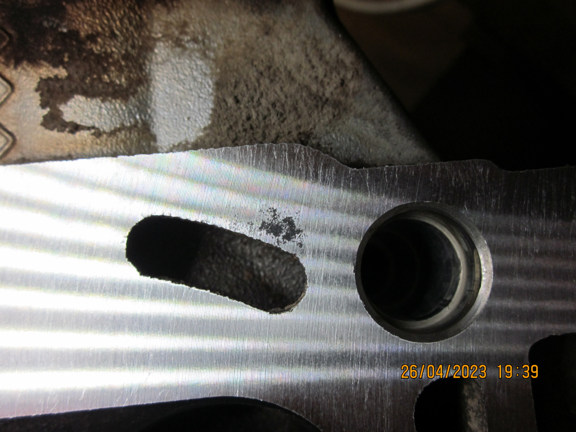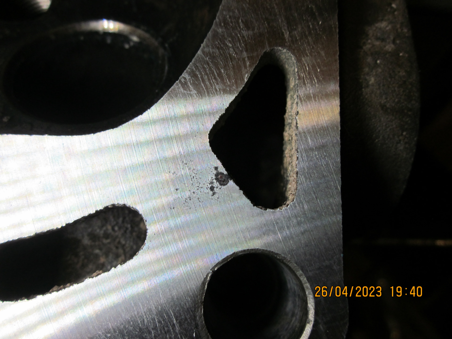 Небольшая зарисовка. Когда мастер сделал первый проход (снял сначала 0,05мм), он обратил моё внимание, что один из углов привалочной плоскости был завален с завода. Теперь понято, почему почти с новья у меня была запотелость в районе правого (по ходу движения) маслослива. Суммарно было снято 0,1мм, больше решили не снимать.