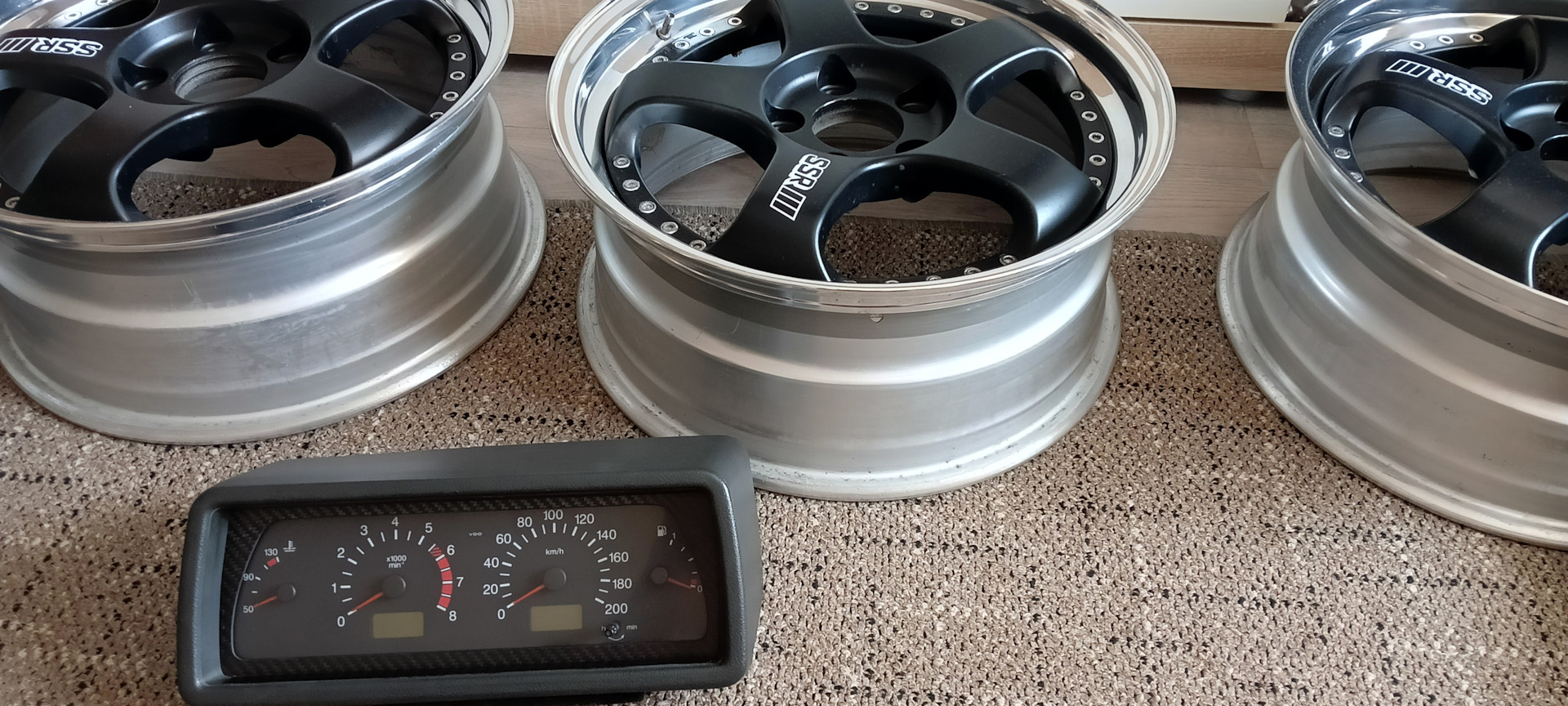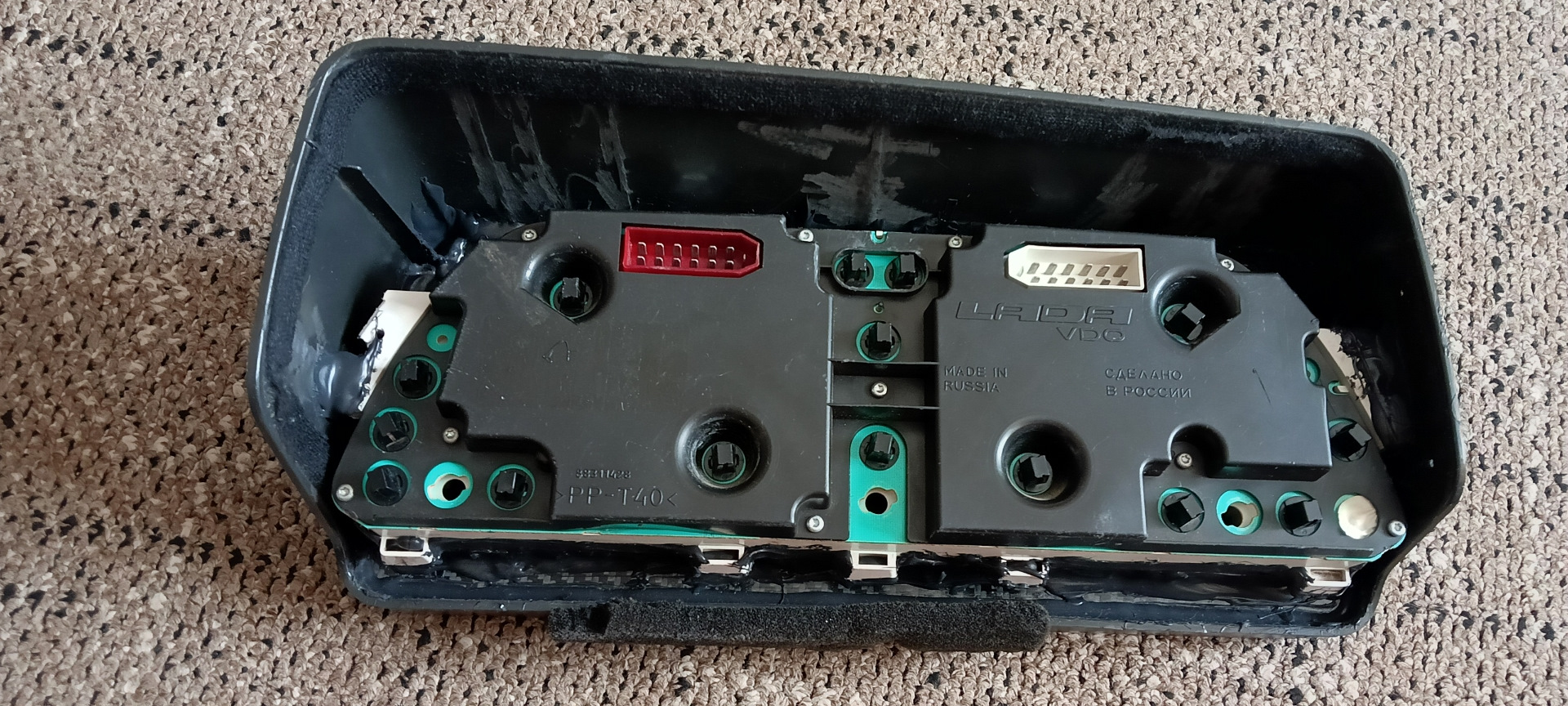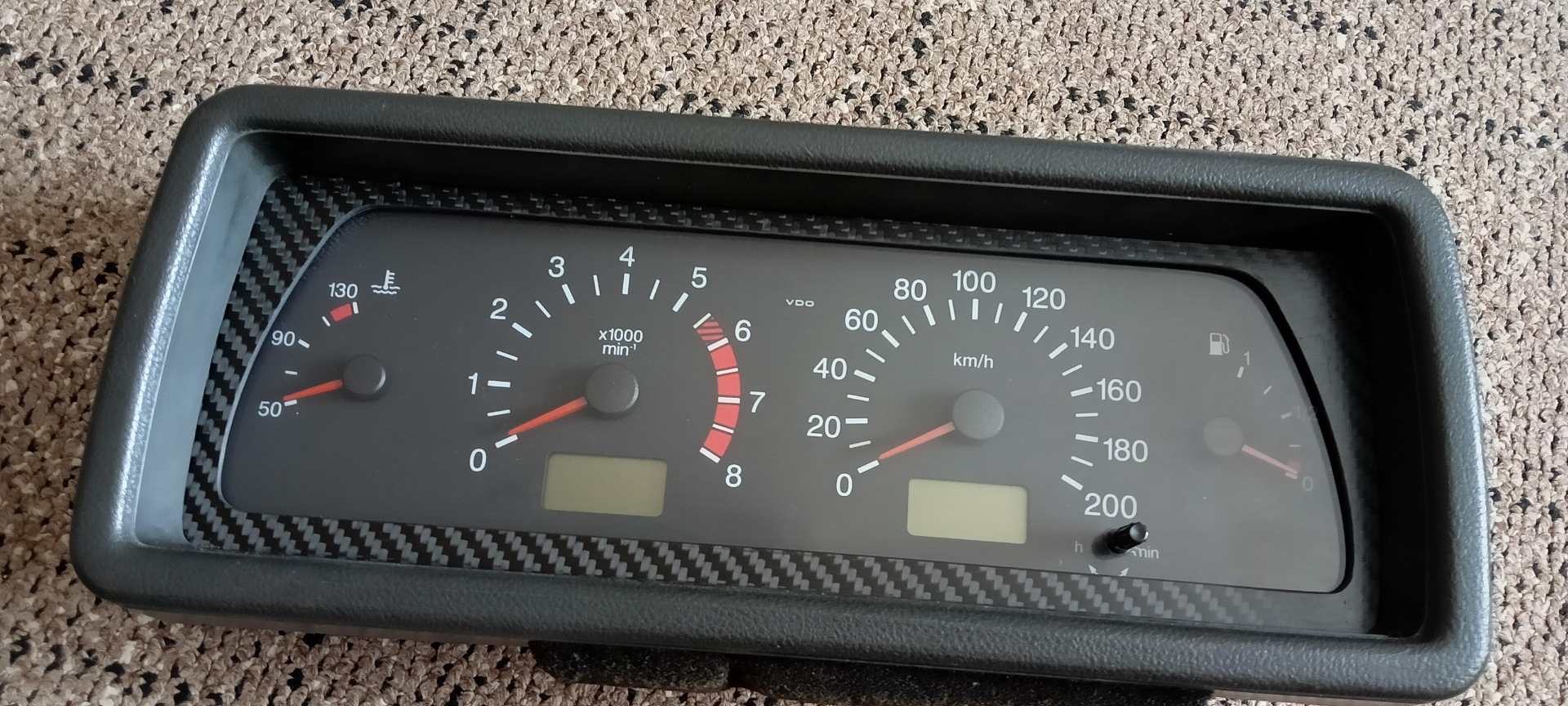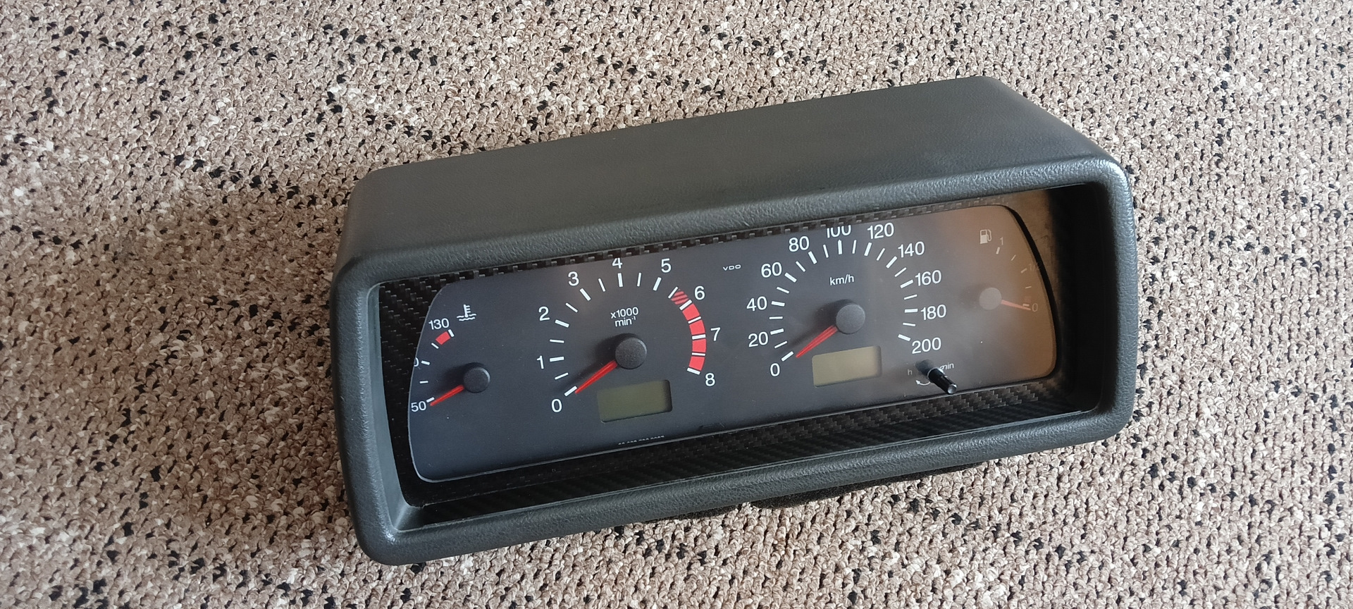 Не помню уже какая версия. Итак VDO + низкая панель. Долго и нудно всё вырезалось бормашинкой. Из листового карбона вырезана рамка. По периметру приборки наклеен кант из пресшпана, изнутри проклеен моделином. Сверху оргстекло 3мм(можно и тоньше, но такое было под рукой). Всё вклеено на чёрный герметик. Крепёж козырька двумя чёрными шурупами. Из чего мы имеем тахометр и приборку на шаговых моторах.