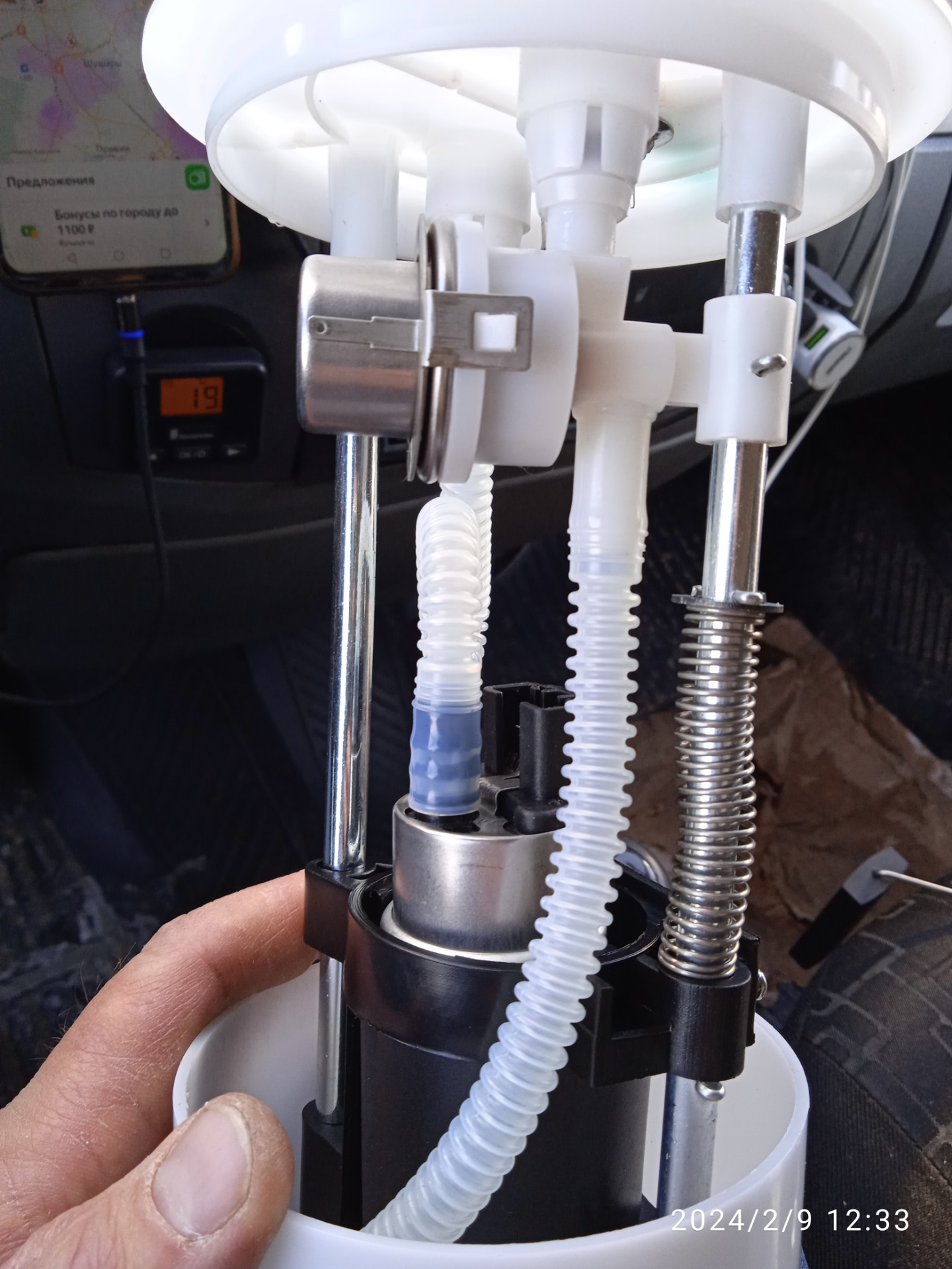 Топливный модуль ещё родной заводской, менял только вставки, но он немножко проблемный, так как клапан, который держит давление на обратке, вставляется в посадочное отверстие буквально чуть-чуть, давлением его выдавливает и давление в системе не держит.(между прижимной пластиной и клапаном запихиваешь трубку от баллончика очистителя и проблема решается, на фото видно какой большой зазор и насколько может выдавить клапан давлением)