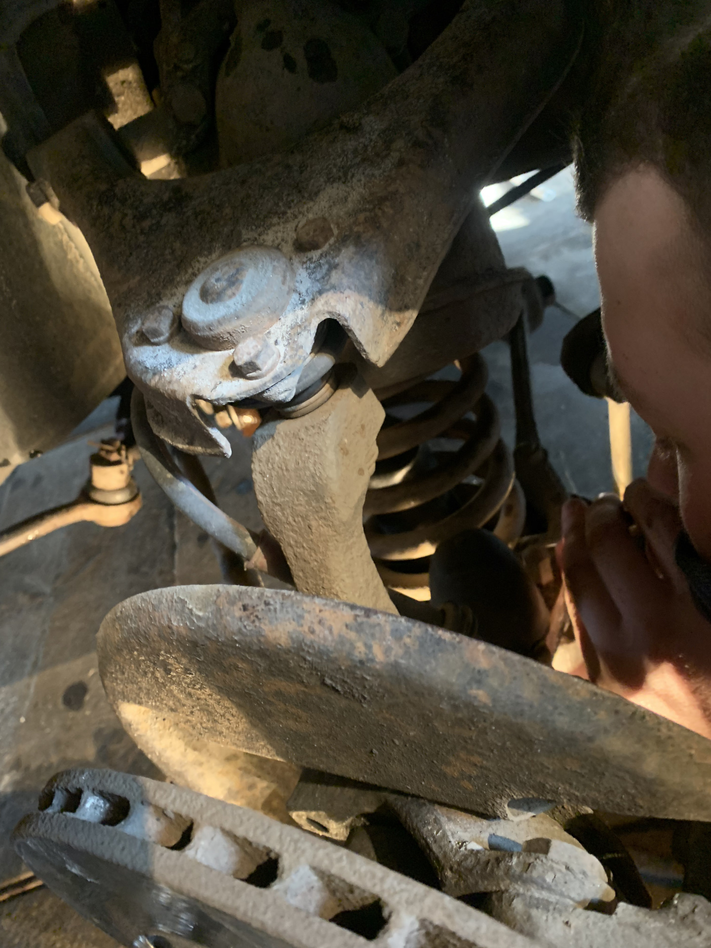 Все откручено, надо вытащить, но не вылазит. Друг дал свой домкрат от октавии и мы приподняли рычаг вверх и амортизатор вышел, НО. Пластмассовый кожух остался там внутри и очень не хотел вылазить оттуда, он стал больше от времени и не пролазил. Короче опять много мата и времени, но мы его вытащили.