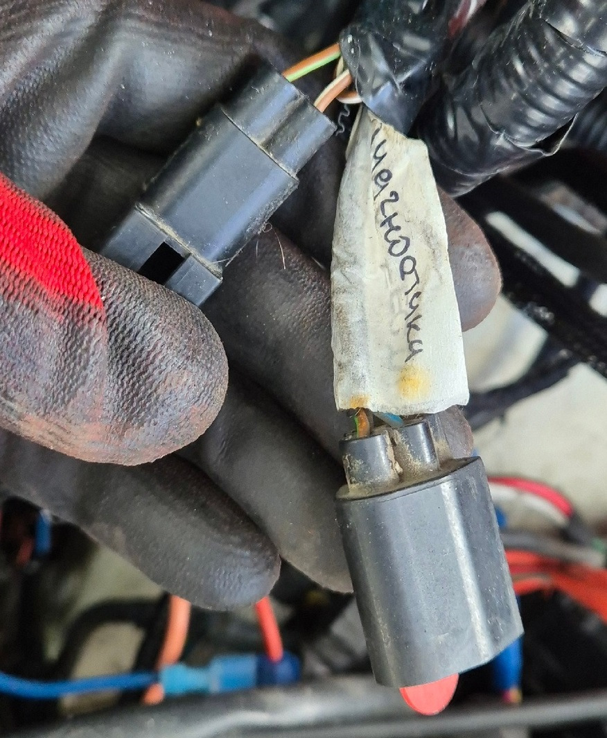 Фишка ниже идет на приборку. Черный +12В, Зеленый — Тахо, Кор.Зел — датчик температуры, Кор.Бел. — давление масла. Я по итогу сделал отдельную фишку. Синий провод на гену идет, но у меня уже отдельный провод на приборку шел.