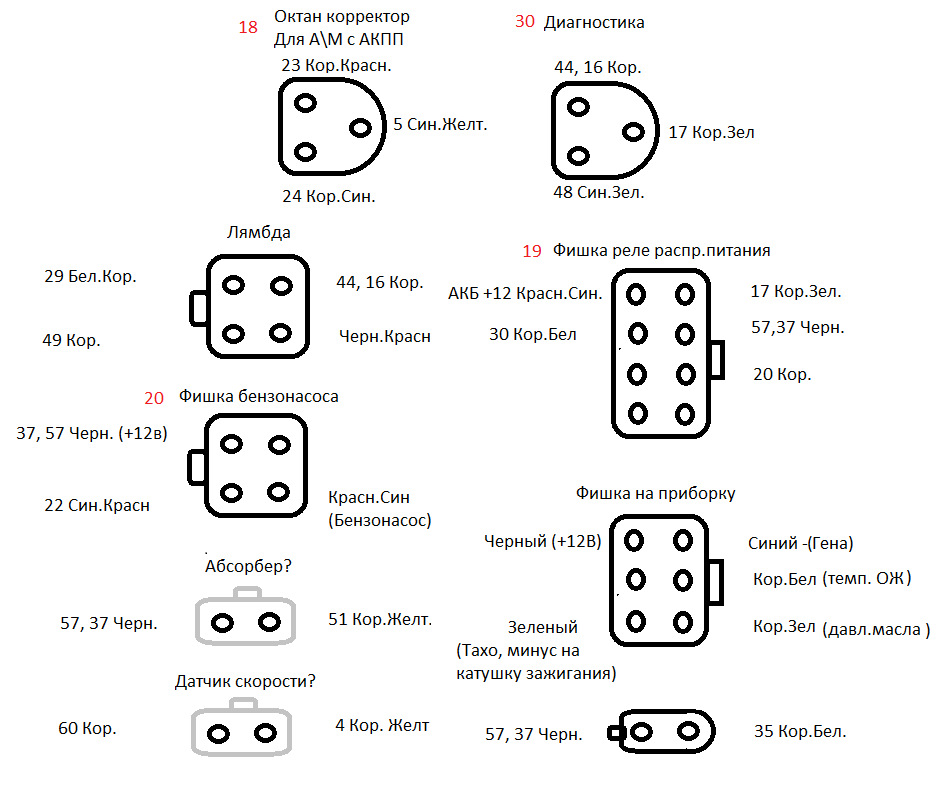 К фишкам подписано: номер контакта ЭБУ и цвет провода (прим. Кор — коричневый, Кор.Бел — Коричневобелый).