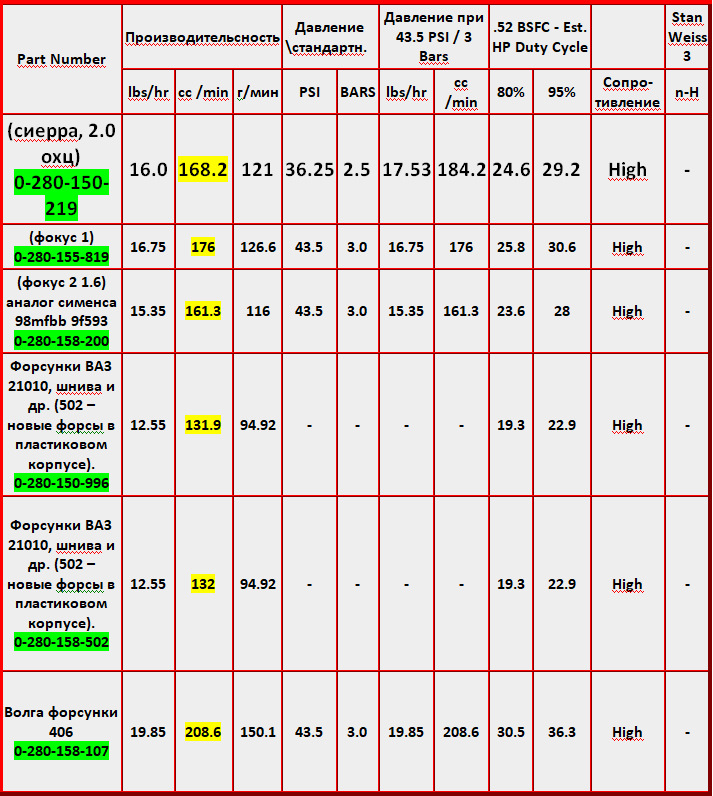 Я выложил таблицу производительности форсунок которые были в наличии. Сначала поставил вазовские, но на холостых двиг совсем глохнет. Вывод: надо давление поднимать, а это надо регулятор давления китайский ставить. Сегодня поставил от первого фокуса форсы — уже бодрее работает