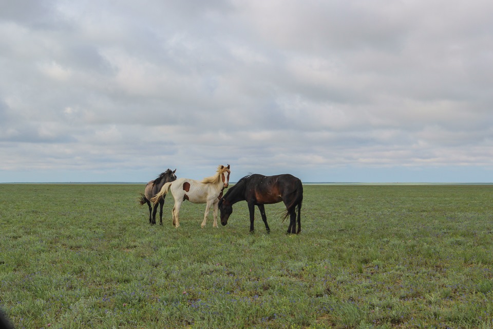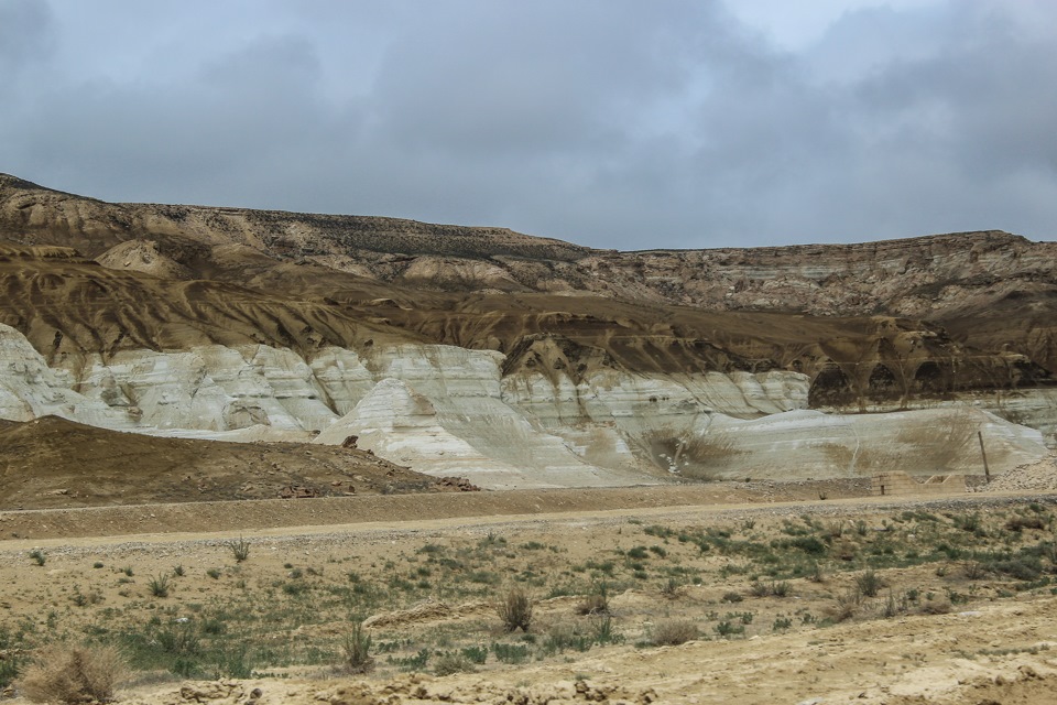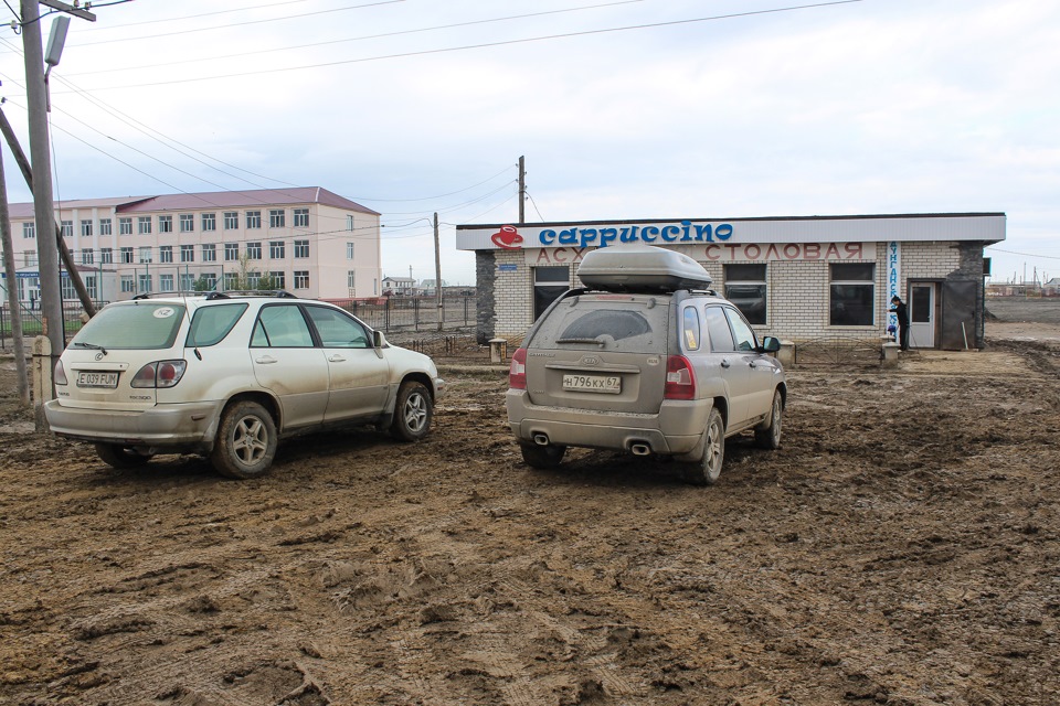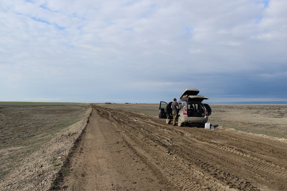 Едем до глубокого вечера. Не можем найти подходящее место для ночлега. Темнеет рано, даже по нашему времени (разница 2 часа). Вокруг степь и солончаки-болота…Подходящих съездов для ночёвки нет…Пару раз пробуем съехать, но после 5 метров от трассы тапки прилипают к грязи и возвращаемся опять на дорогу…Принимаем решение сворачивать на ответвления к ж/д, вдоль которой идёт асфальт, благо они встречаются каждые полста километров…Все устали…Паркуемся как можно ближе к обочине, что б не улететь в овраг…В Мангистау освещение дорог заканчивается вместе с границами населённых пунктов, так что темно как в …опе…Заезжаем в какую-то грязь, но выбора нет…Принятый алкоголь снимает усталость, и всё кажется не так уж и плохо, хотя стоим в грязи по щиколодки) На утро вышло солнышко, и мы разглядели местность, ночью всё было по-другому: