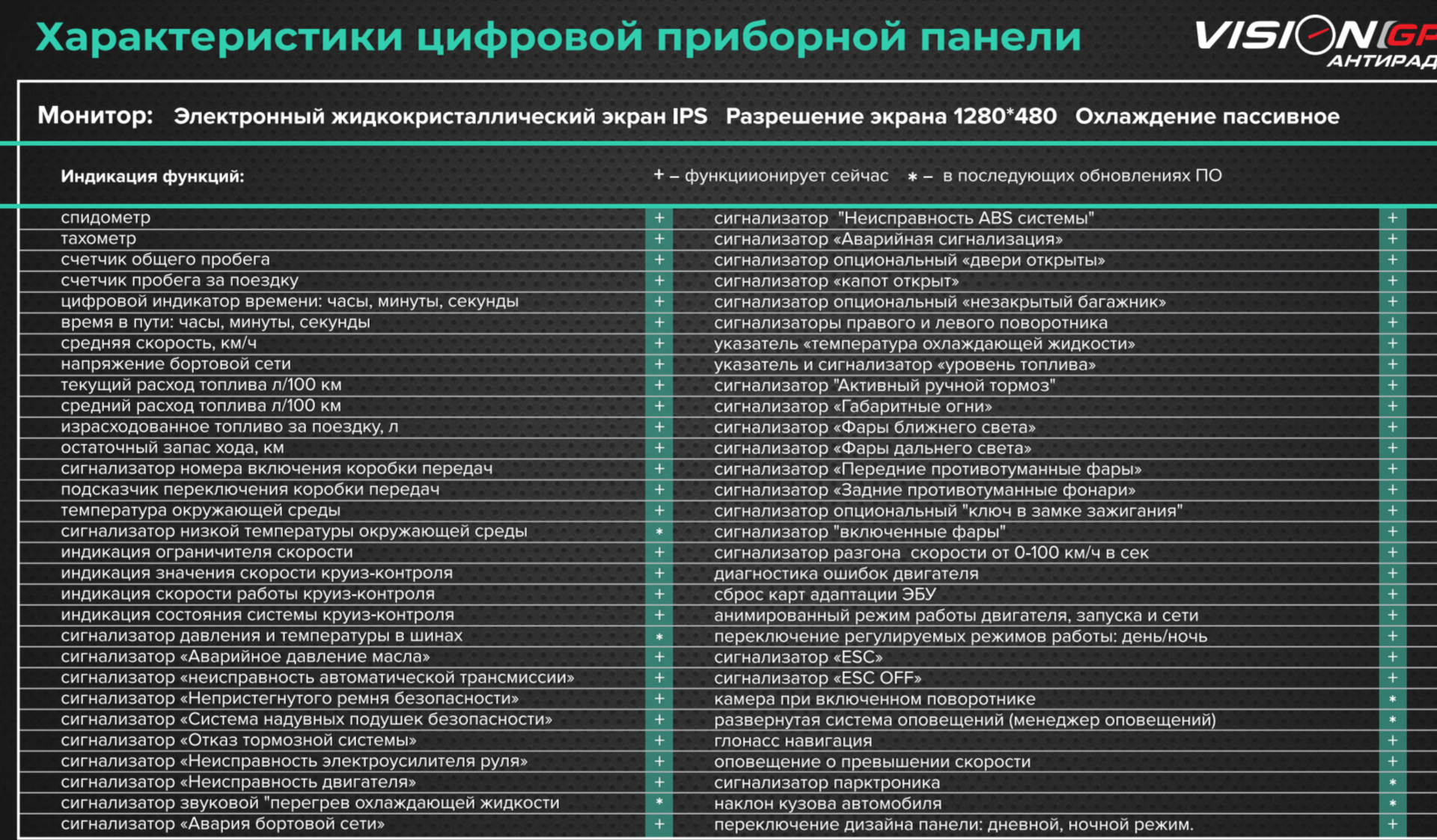 Мне самому стоковая приборка вообще не нравится как только ее увидел, яркость не регулируется, плохо читаема, и полностью согласен — дерьмо. По поводу "Тюн-Авто" VISION: Ты пишешь; дневной пробег и средняя скорость там всего лишь надо нажать кнопку и все появится… Что только не делал, день работает неделю нет. Какую кнопку нажать? Чушь какя то… Все сырое, недоработанное, шрифты очень мелкие, В меню, настройки зайти целая проблема.