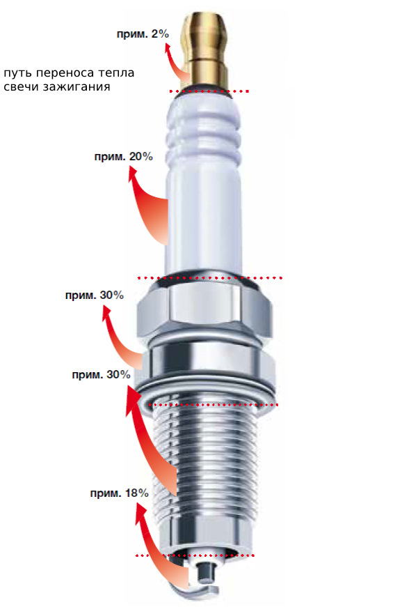 На короткие промежутки времени в процессе сгорания температура в цилиндре достигает 1000°C, что приводит к нагреву свечи зажигания. Свеча зажигания отдает около 80% поглощенного тепла прилегающим областям различными способами распределения тепла. Большая часть тепла передается с резьбы свечи непосредственно на головку цилиндра. Лишь около 20% тепла поглощается и рассеивается проходящей воздушно-топливной смесью. Поэтому свеча зажигания всегда должна завинчиваться с нужным усилием.