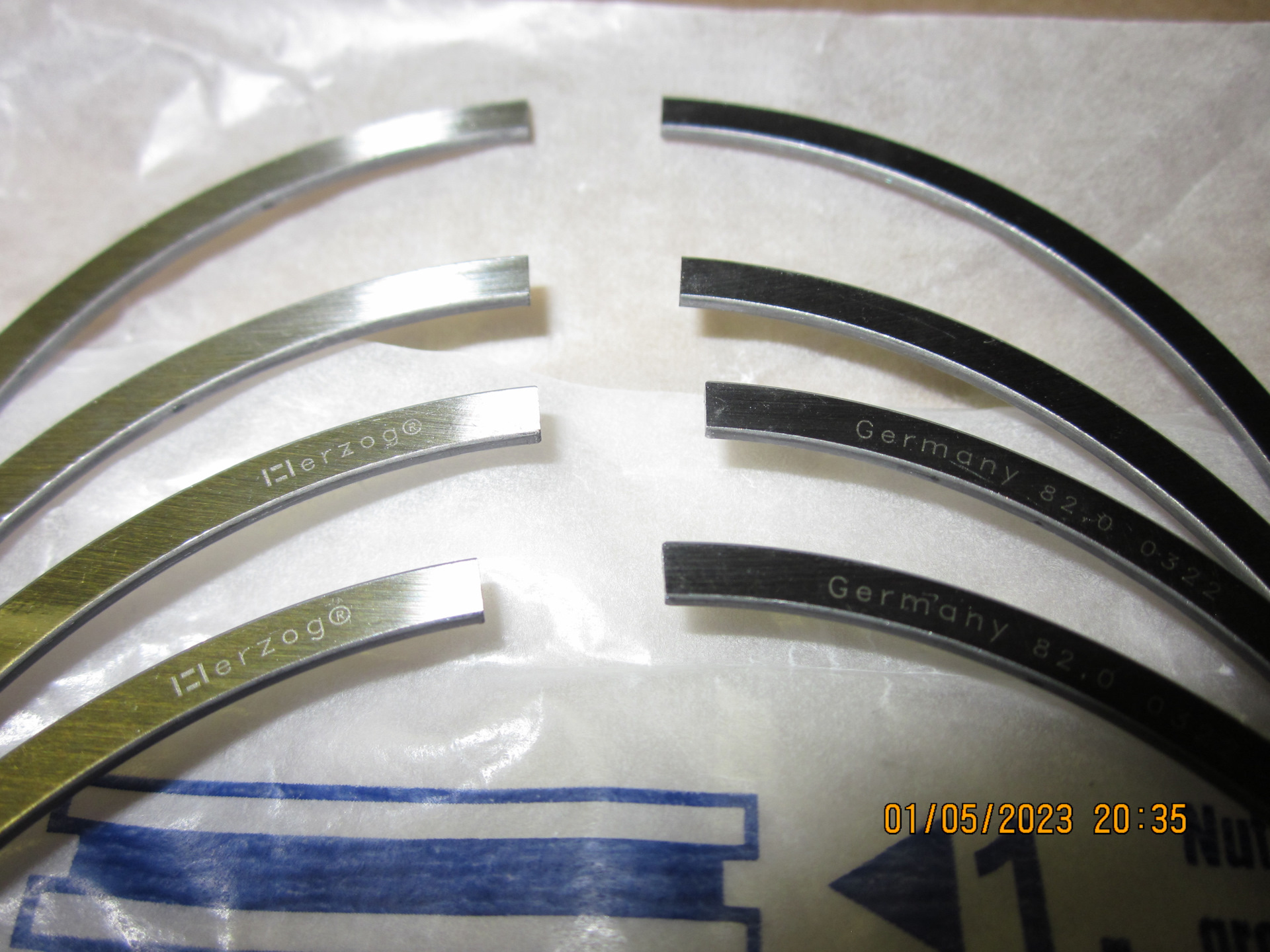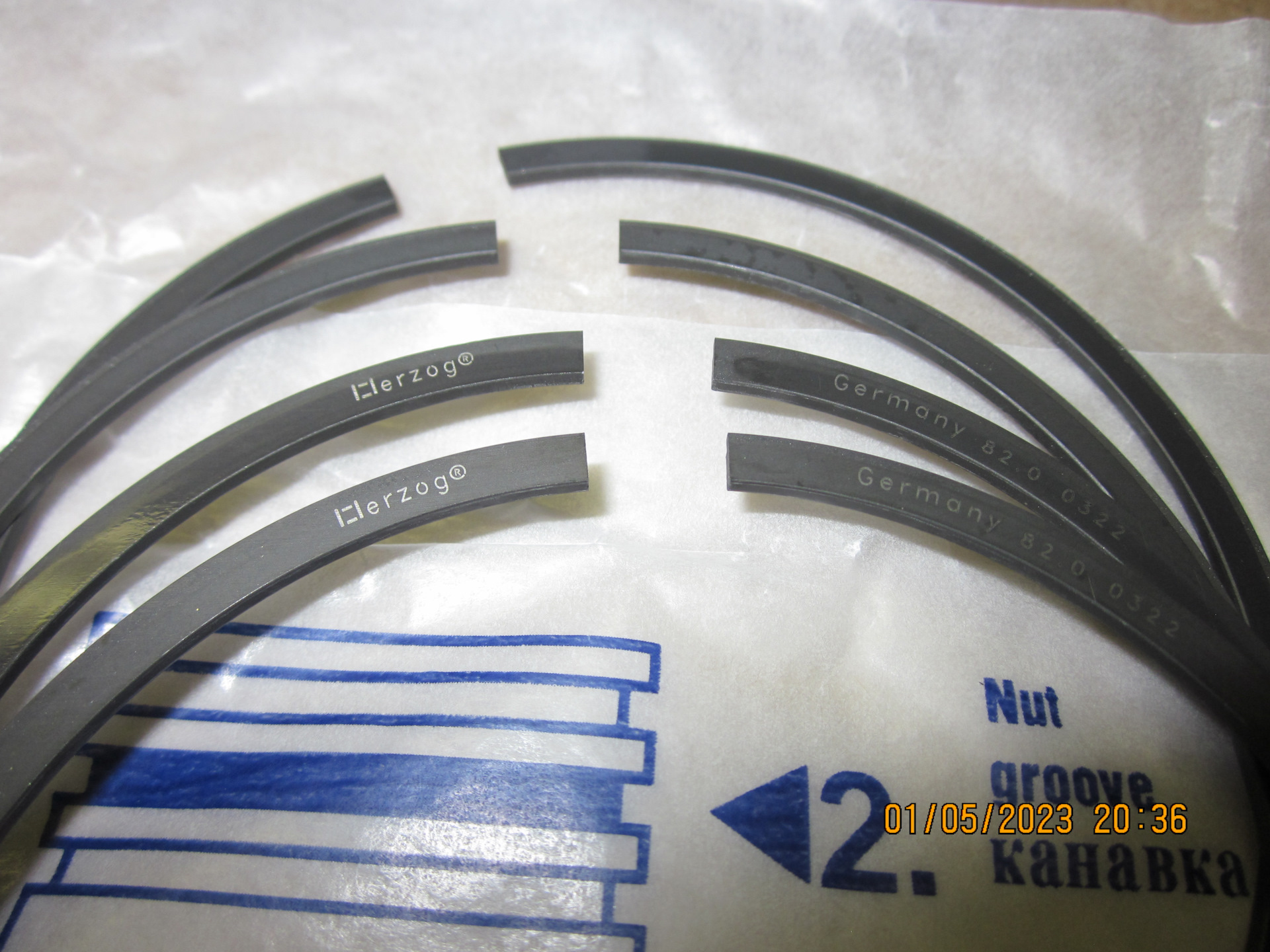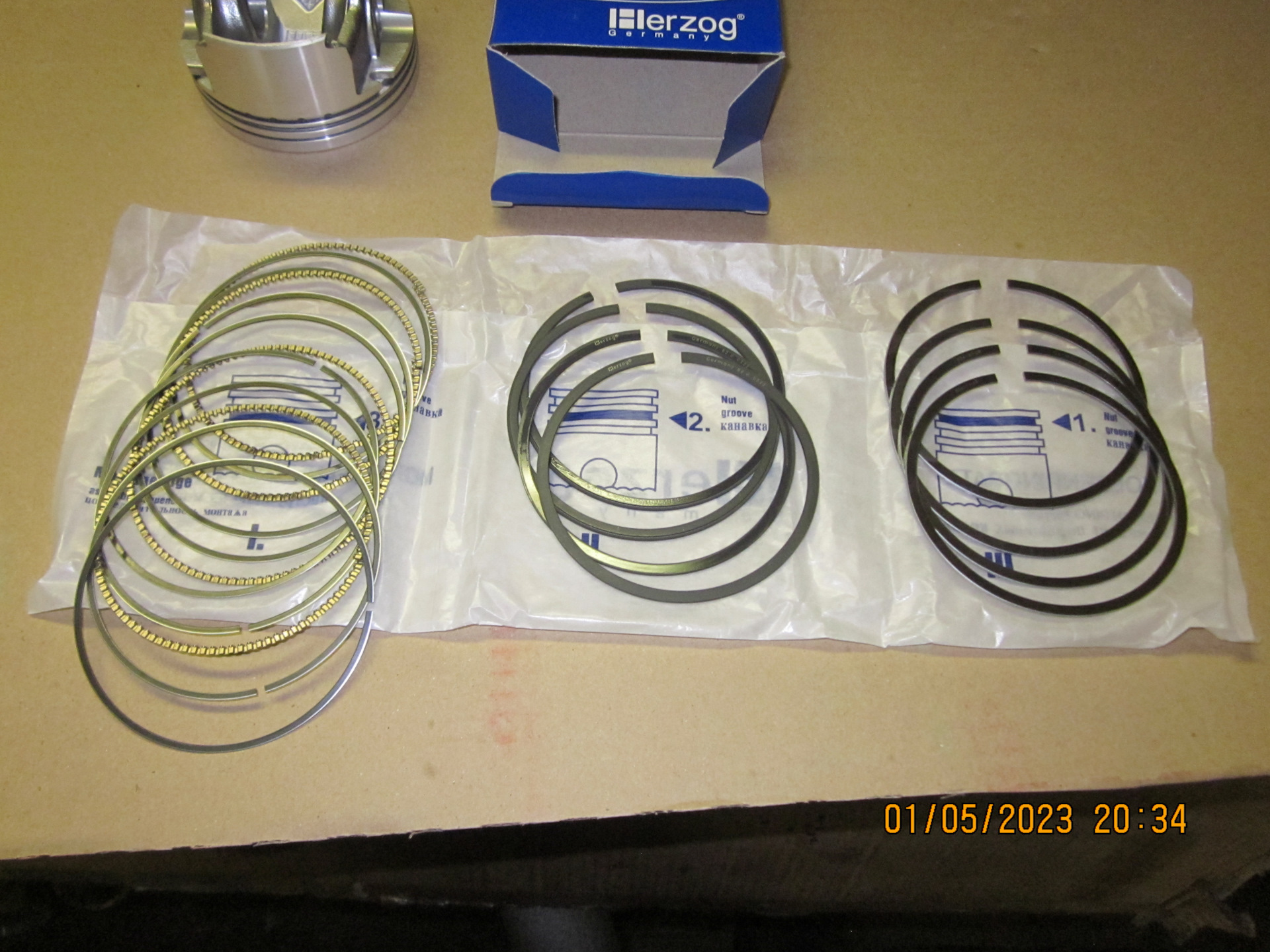 Поршневые кольца HERZOG, маслосъёмные кольца наборного типа с одним фигурным радиально-осевым расширителем (стоковые были коробчатые); нижние (толстые) компрессионные кольца скребкового типа (стоковые были обычные).