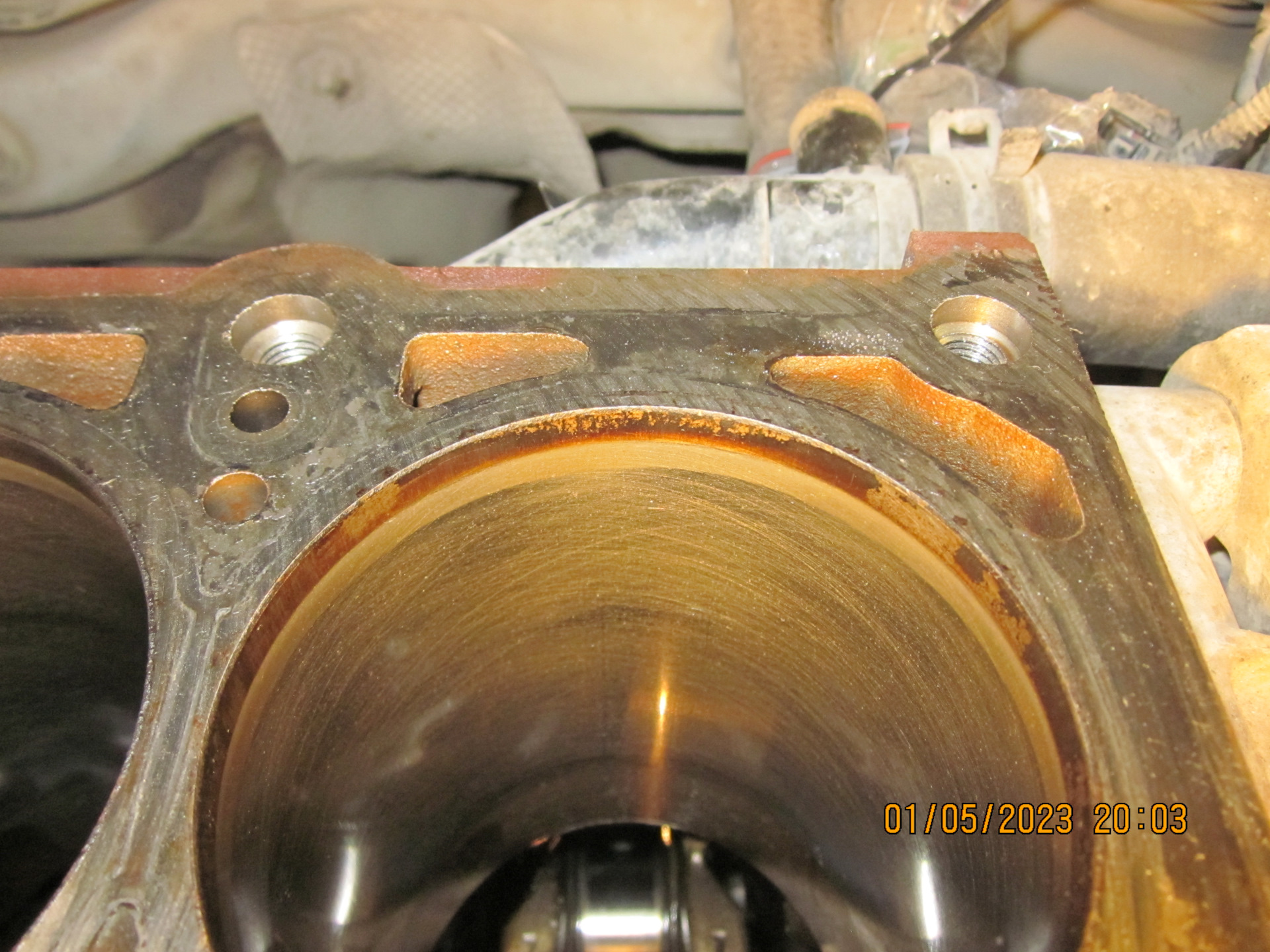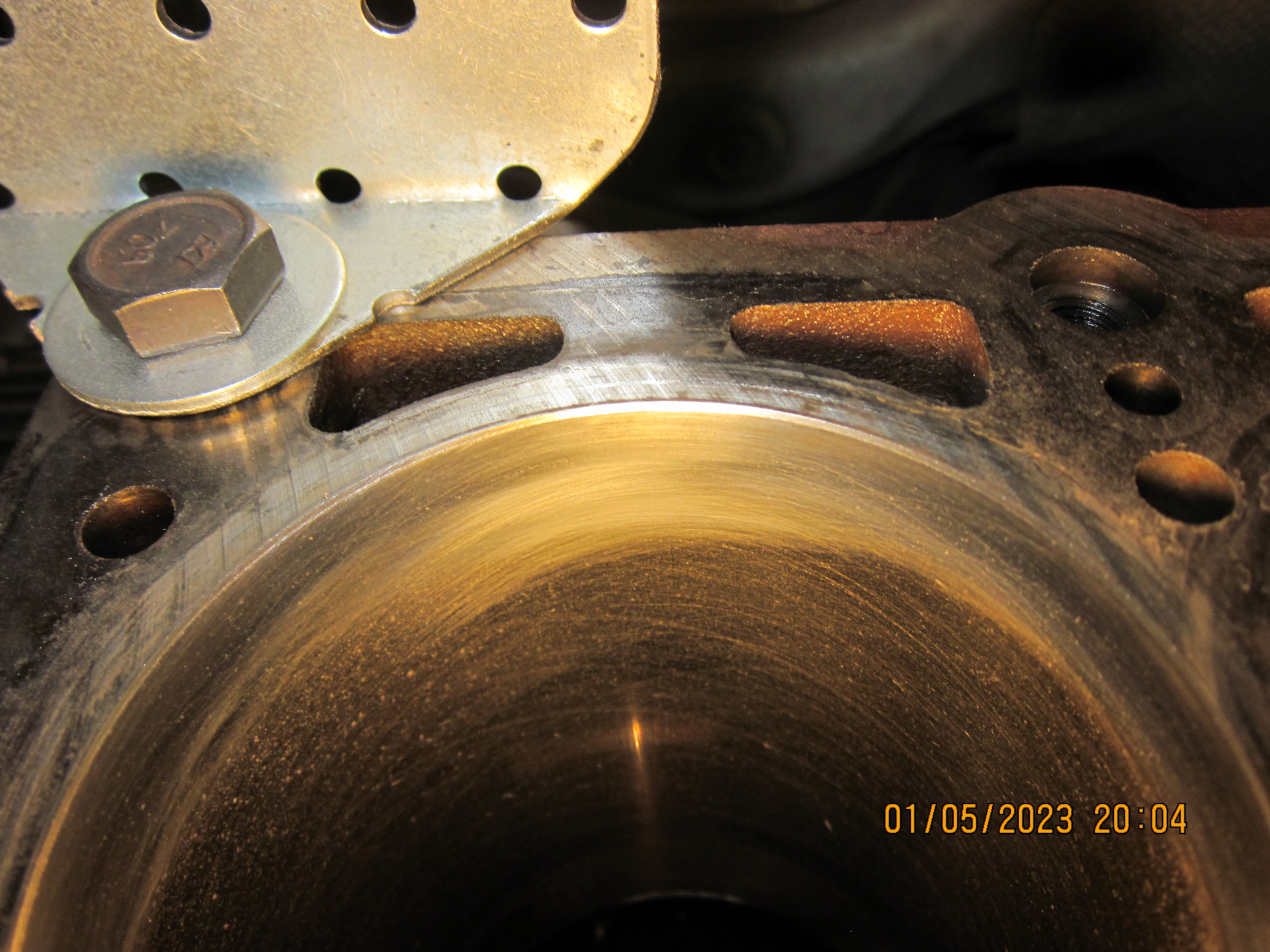 Расправившись с ГБЦ, принялся за подготовку к сборке низа. Из-за масложора на стенках цилиндров в верхней части (где не доходят поршневые кольца) образовались отложения нагара, которые следовало бы удалить. Попробовал сделать это альтернативным способом: зачистил нагар вручную скотч-брайтом. Метод понравился – нагар счищается достаточно быстро и без пробелов, да и к чугуну вполне гуманно (см. фото).