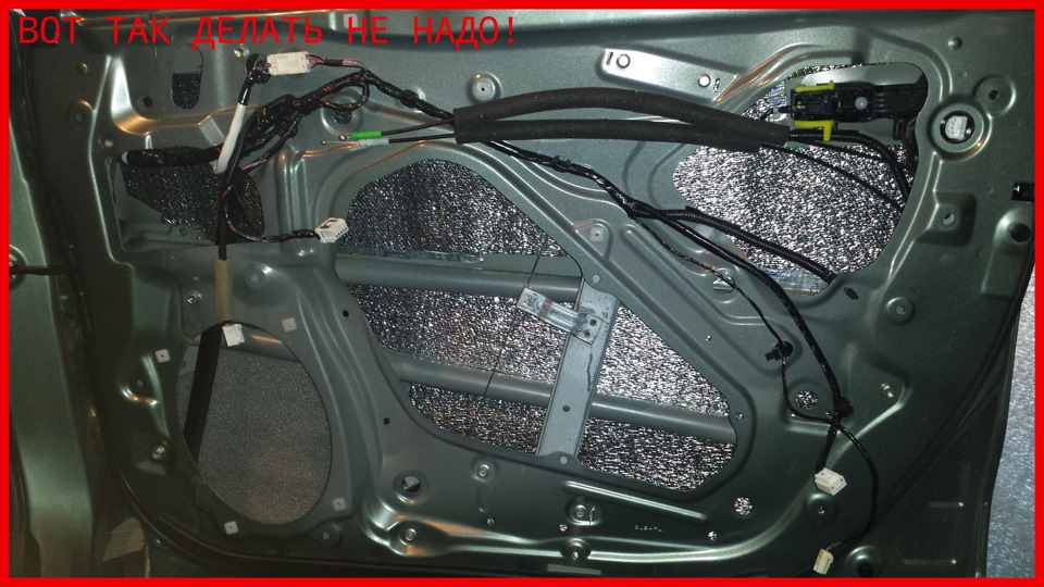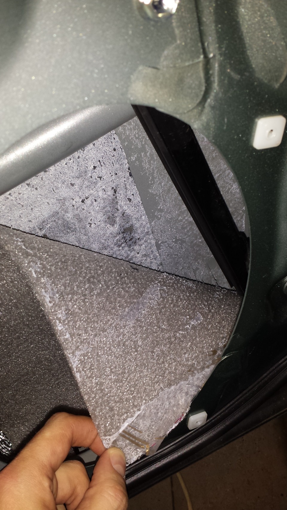В процессе обклейки дверей я допустил очень серьёзный просчёт, оклеив внутреннюю поверхность двери Акцентом. Первые семена сомнения заронили критики на форумах — Акцент КС и КС ЛМ не имеют влагостойкого клеевого слоя. Погода в московском регионе стояла дождливая, и разобрав одну дверь я понял, как прокололся — внутри все насквозь мокрое, Акцент напитался водой, стал тяжелым, а клей на нижних листах превратился в белёсые сопли так, что шумка весьма охотно отвалилась. В общем, еще 4 дня разбирал двери вновь, отдирал Акцент и оттирал клеевой слой. А поскольку прикатывал на совесть… в общем, не дай Бог такое!