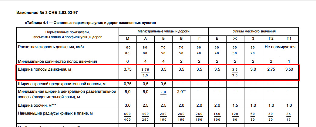 В гост минимально допустимая ширина полосы составляет 2,75 метра для улиц местного значения П2.
