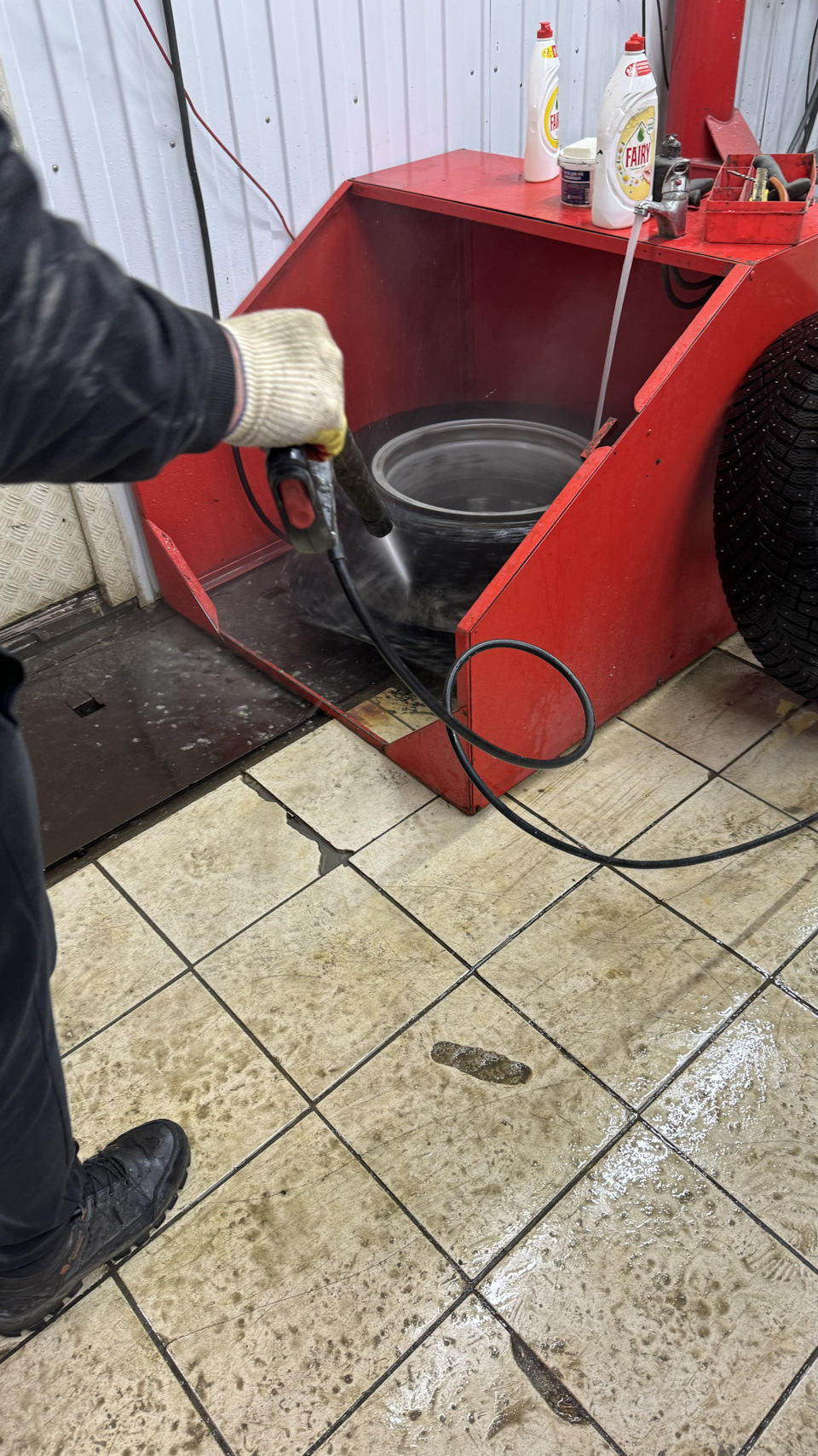 У этих парней своя крутящаяся мойка колес, шлиф машинка для снятия старых грузил, что по Новосибирским меркам сервиса очень непривычно видеть! Для меня уже был показатель.