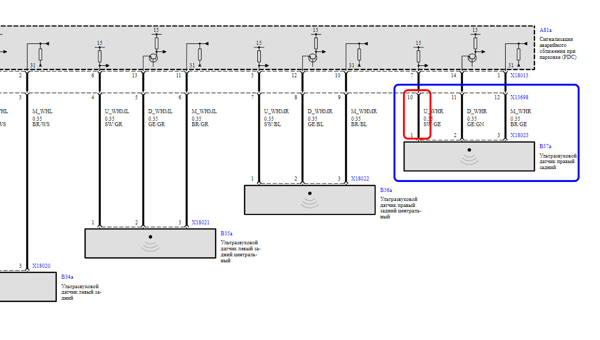Снял косу парктроников, и согласно схемы стал ее прозванивать. Проблема у меня была с проводкой на задний правый датчик и прозвонка показала, что проблема с проводом "контакт 1 на самом датчике/10 контакт на фишке".