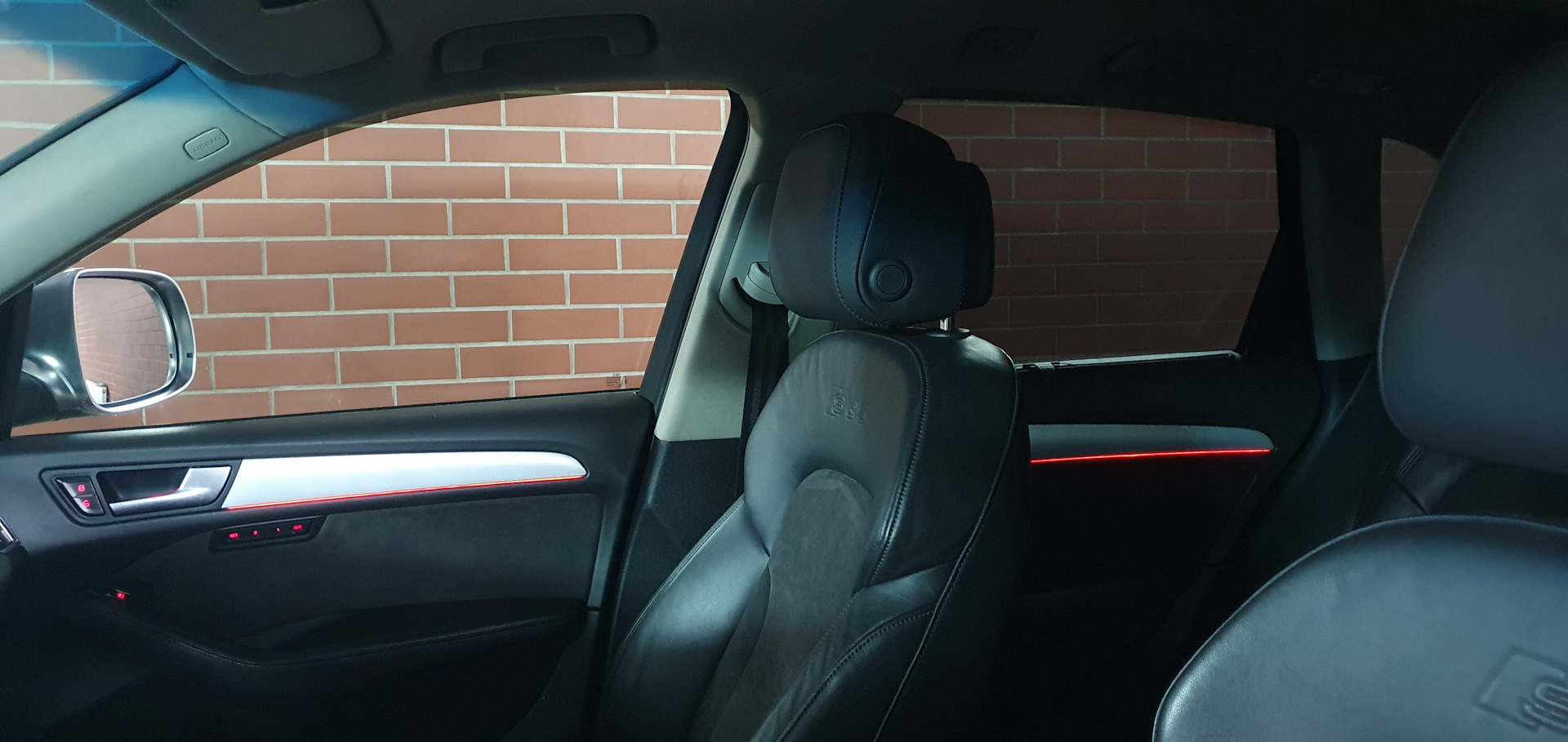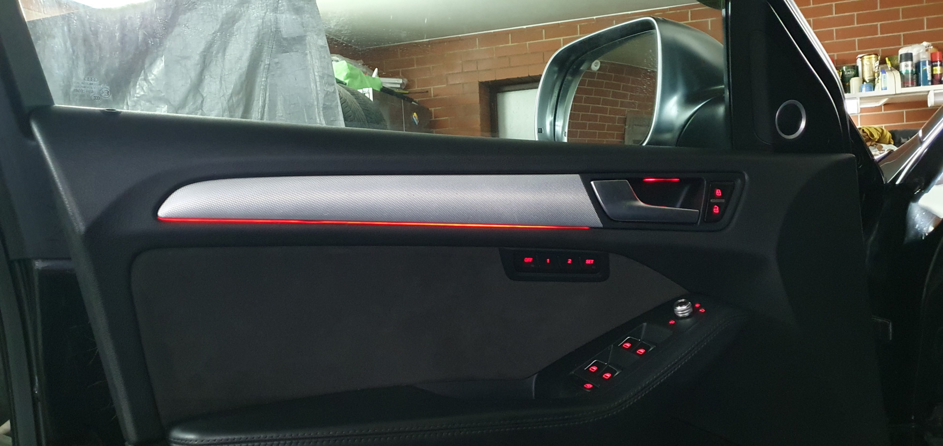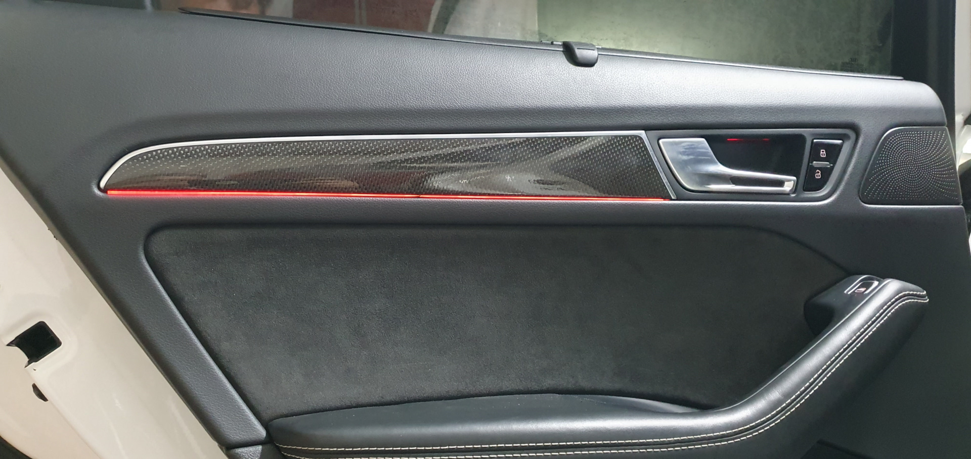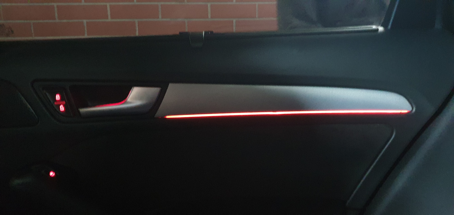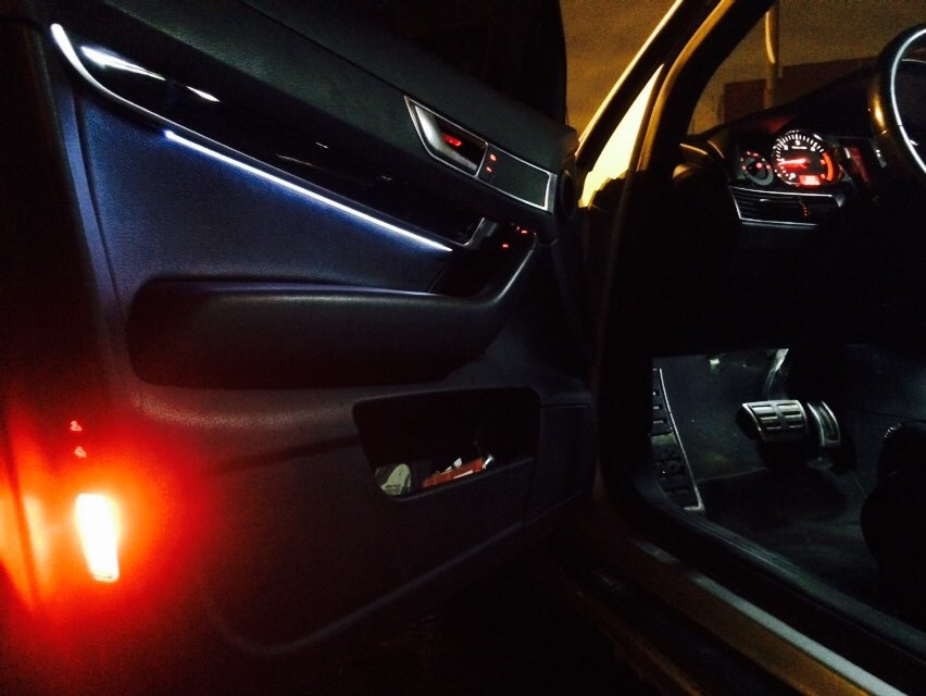 Я замерил длину ленты, она составила 37см по нише накладки. Затем колебался на счет цвета, красный или белый, т.к. в А6 штатная была белая. Интересное еще на тот момент аж 2007г уже были такие решения, работала от блока двери, при открытии двери светила ярче, при закрытой двери приятный лунный свет!