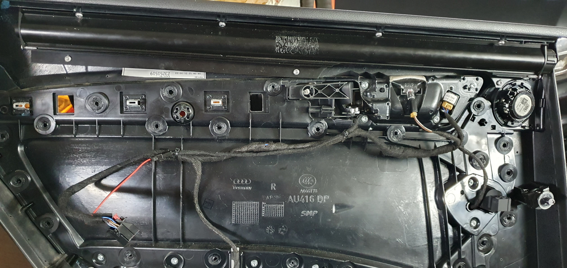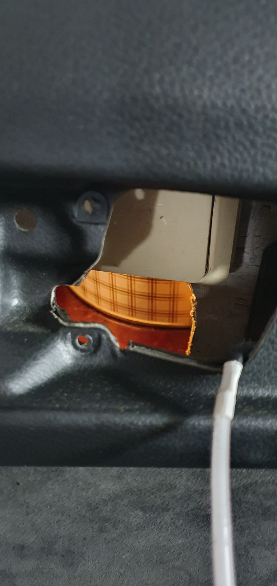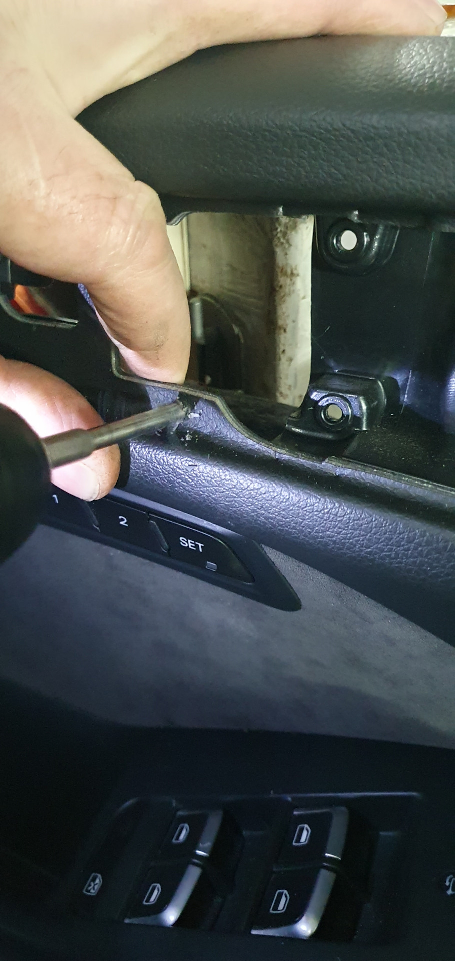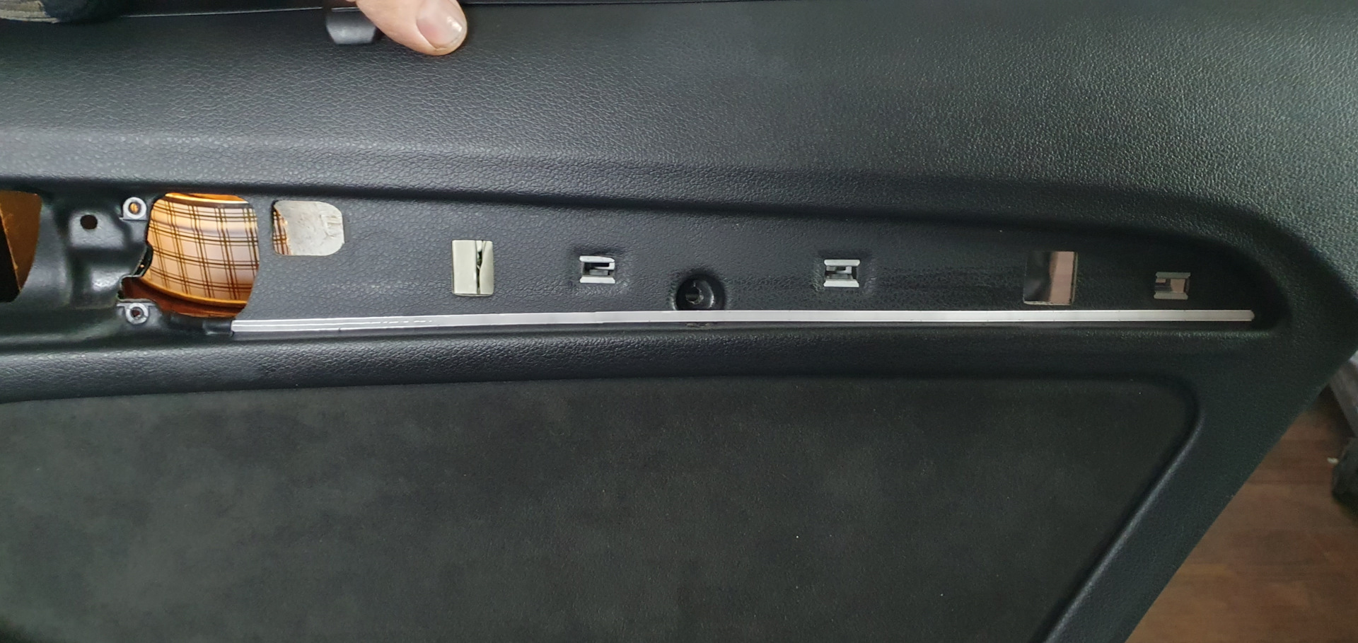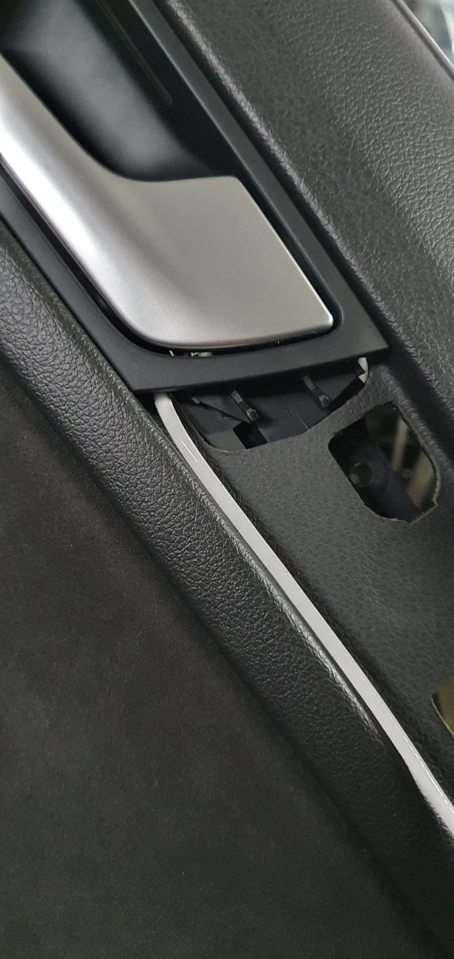 Приступим к установке. Снимаем декоративные накладки, откручиваем 4 болта и снимаем обшивку. Начали с задней двери. Примеряем ленту. Длина 37см как раз самое то. Сначала завел около ручки, но не понравилось плотность прохода.