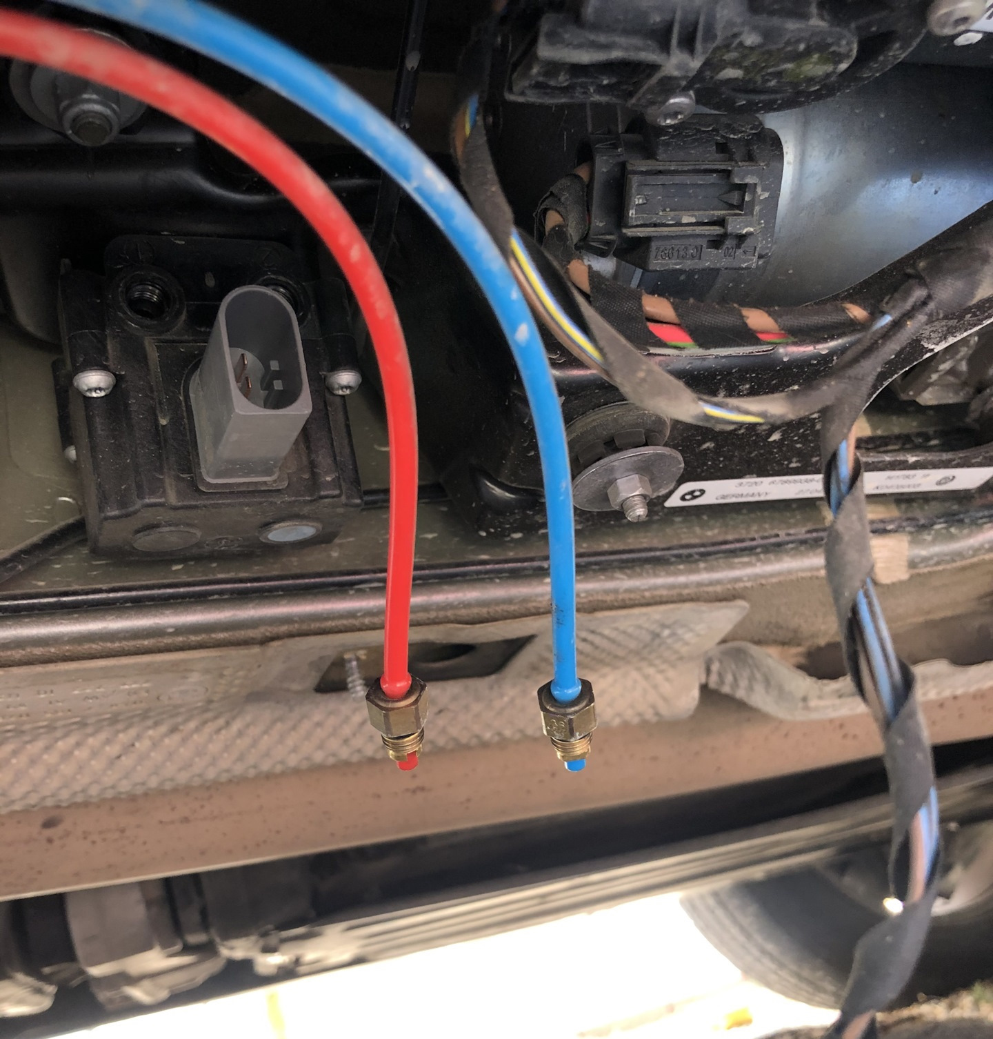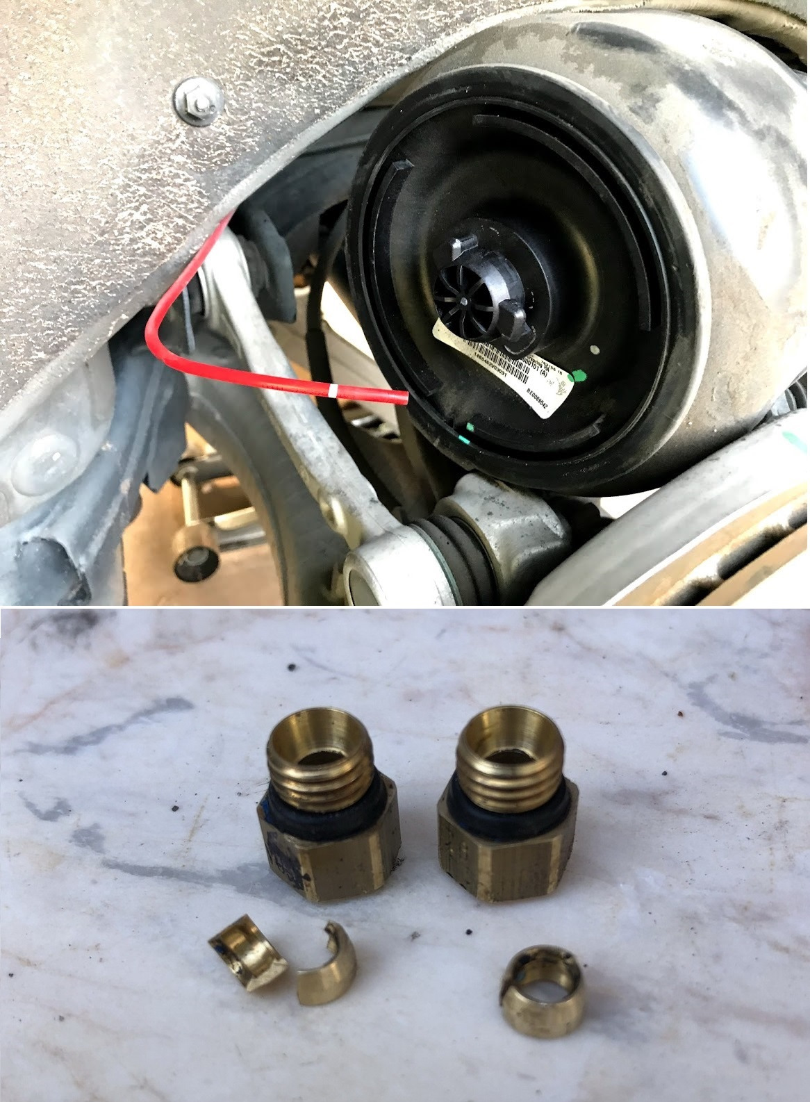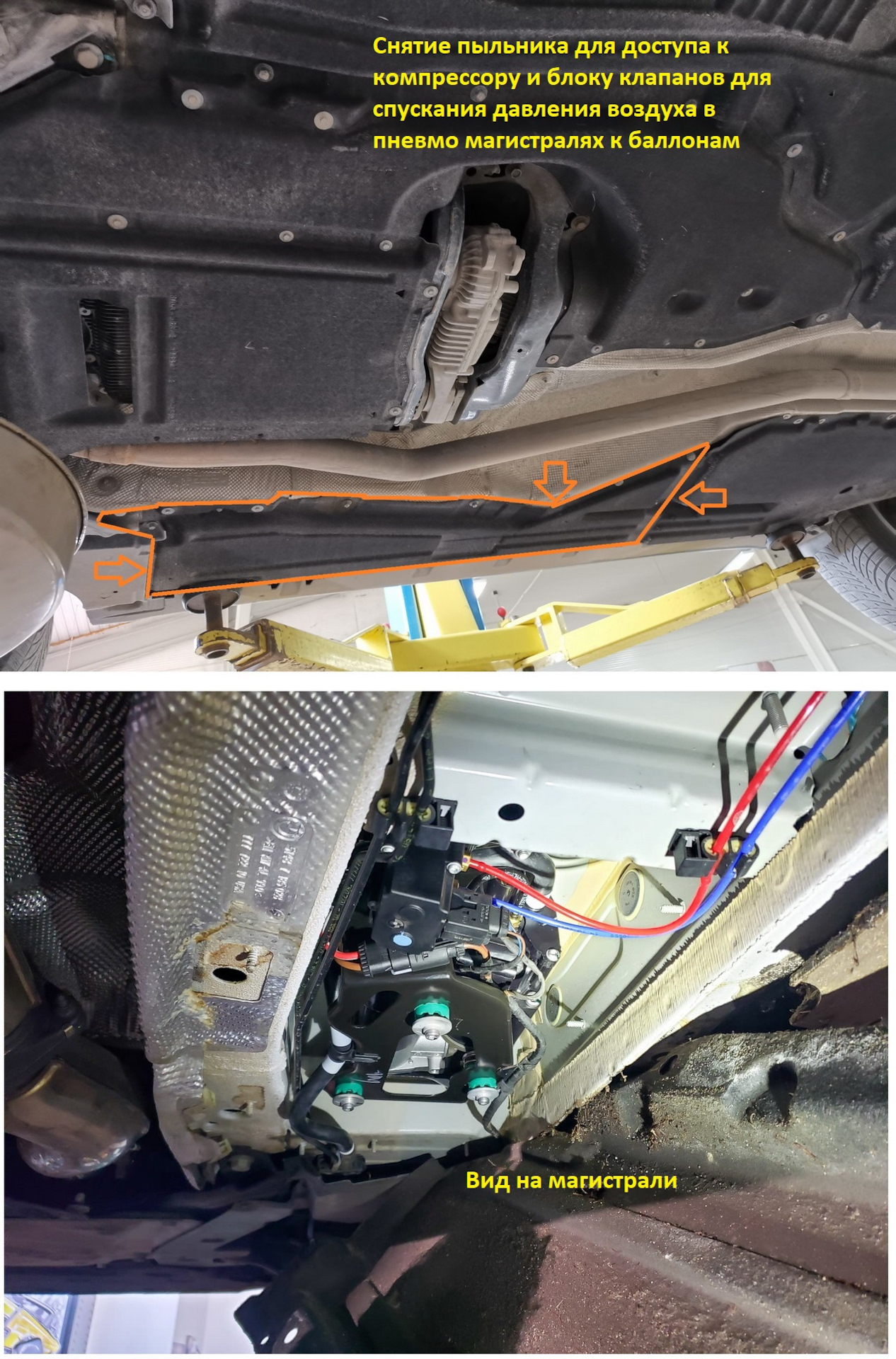 2.Б) можно чуть открутить штуцеры пневмомагистралей, идущий к пневмобаллонам, из блока клапанов возле компрессора и выпустить давление воздуха. Для этого нужно: поднять машину на подъемник или на домкрат. Откручиваем болты и снимаем колесо справа снять нижний пыльник днища прикрывающий компрессор с блоком клапанов. И немного (чуть) откручиваем штуцера поочерёдно и выпускаем давление воздуха. Затем завернуть обратно штуцеры в блок клапанов для восстановления герметичности.