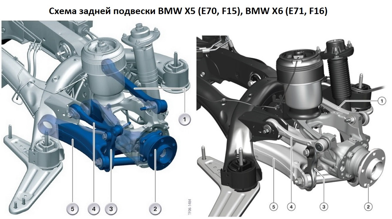 В ходе изучения темы выяснилось, что шасси и подвеска у BMW X5 (F15) и BMW X6 (F16) почти полностью идентична с BMW X5 (E70) и BMW X6 (E71), т.к. машины на одной кузовной платформе. По этому по вопросам процесса замены деталей и ремонта можно смело смотреть и предшествующее поколение машин.