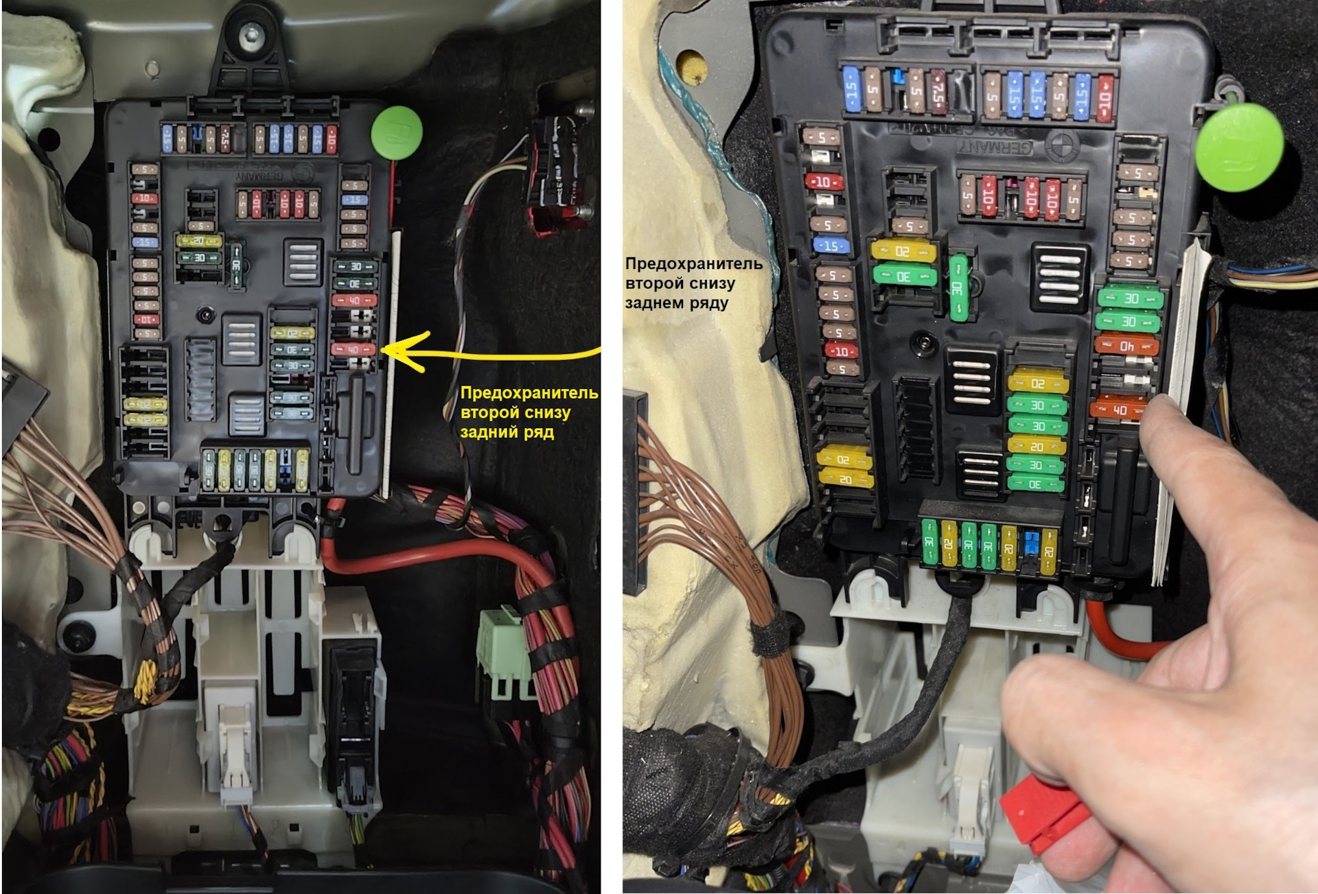 1.Сначала вынимаем предохранитель компрессора, чтобы при замене исключить работу пневмокомпрессора. Для этого открываем в багажнике справа крышку и видим панель предохранителей и реле. В самом заднем вертикальном ряду второй снизу предохранитель (40А) вынимаем.