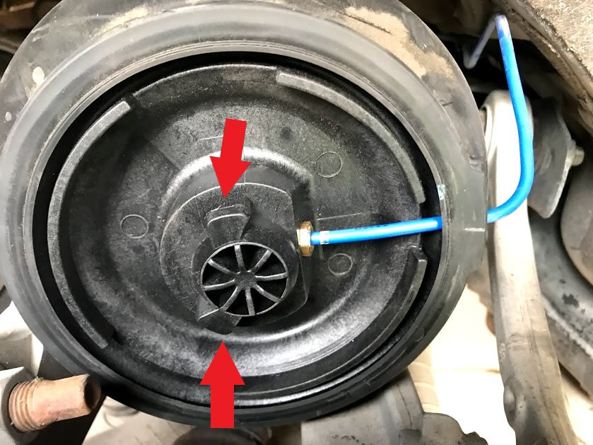 4.В) Верхнюю часть пневмобаллона вставляем в отверстие в кузове и поворачиваем по часовой стрелке для зацепления и фиксации.