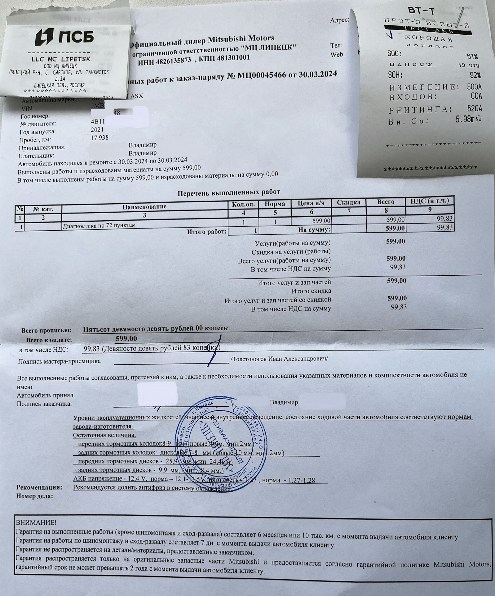 Позвонили из автосалона МЦ Липецк (бывший официальный дилер Mitsubishi Motors, в настоящее время — марки JETOUR, созданной в январе 2018 года) с предложением сделать у них по акции диагностику автомобиля по 72 пунктам. Конечно я понимал, что это очередной "развод на бабки", но все равно записался и приехал, чтобы хотя бы более тщательно проверить состояние подвески перед началом сезона.