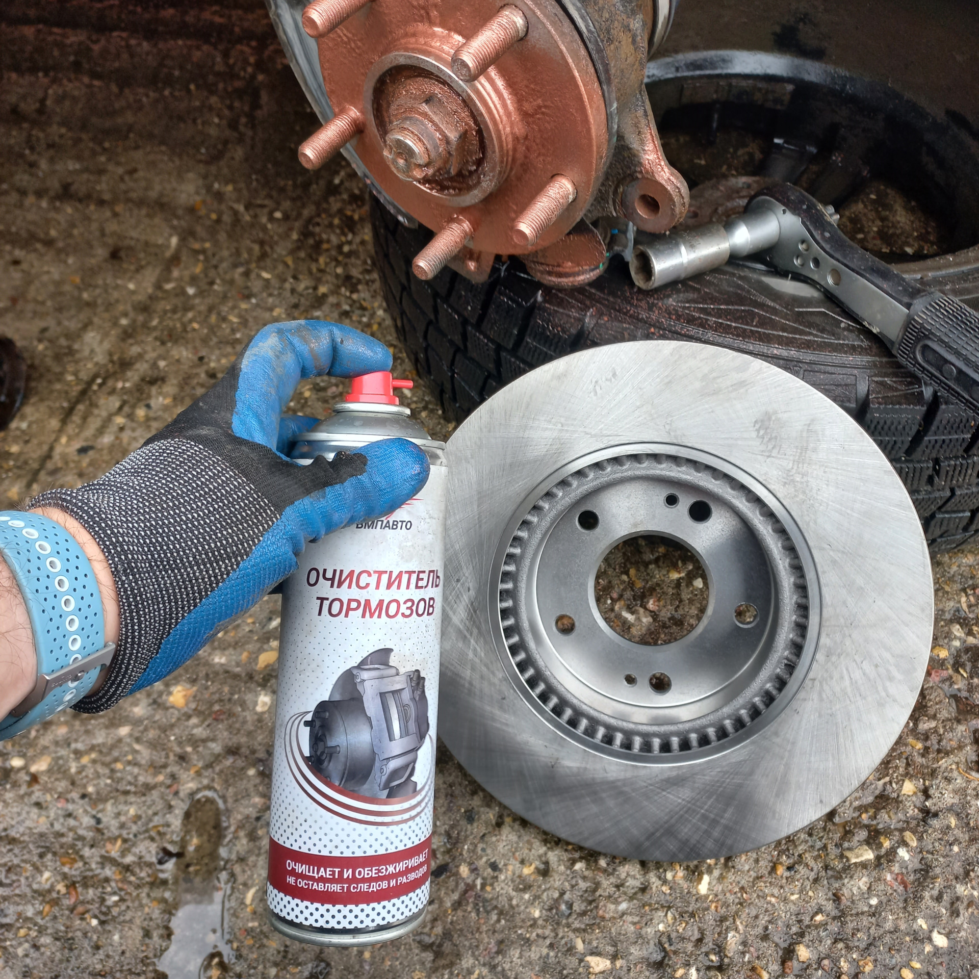 Новый диск тоже обрабатываем средством для очистки тормозной системы и ставим на место.