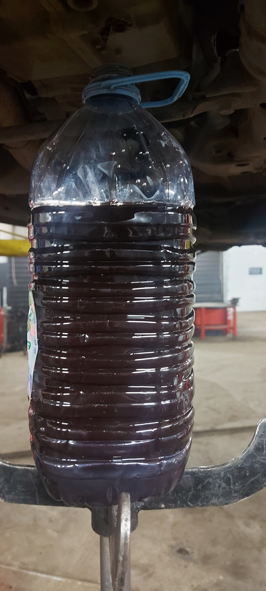 Запускаем двигатель и сливаем около литра + — Глушим двигатель. Чтоб не ошибиться в точности объёма. Я взял пустую канистру от масла которую вы ранее залили в Акпп и перелил туда ровно один литр. Затем слил этот литр чернющего масла. Конечно в баклахе осталось какое то колличество масла. И заново наполняем пустую тару из под масла. Условно получилось 1 литр и 300 грамм. Значить сверху нового заливпем столько же. 1 литр 300 грамм. И так продолжаем пока в баклаху не пойдёт уже чистое, светлое масло. У меня на 10 литре пошло светленькое.
