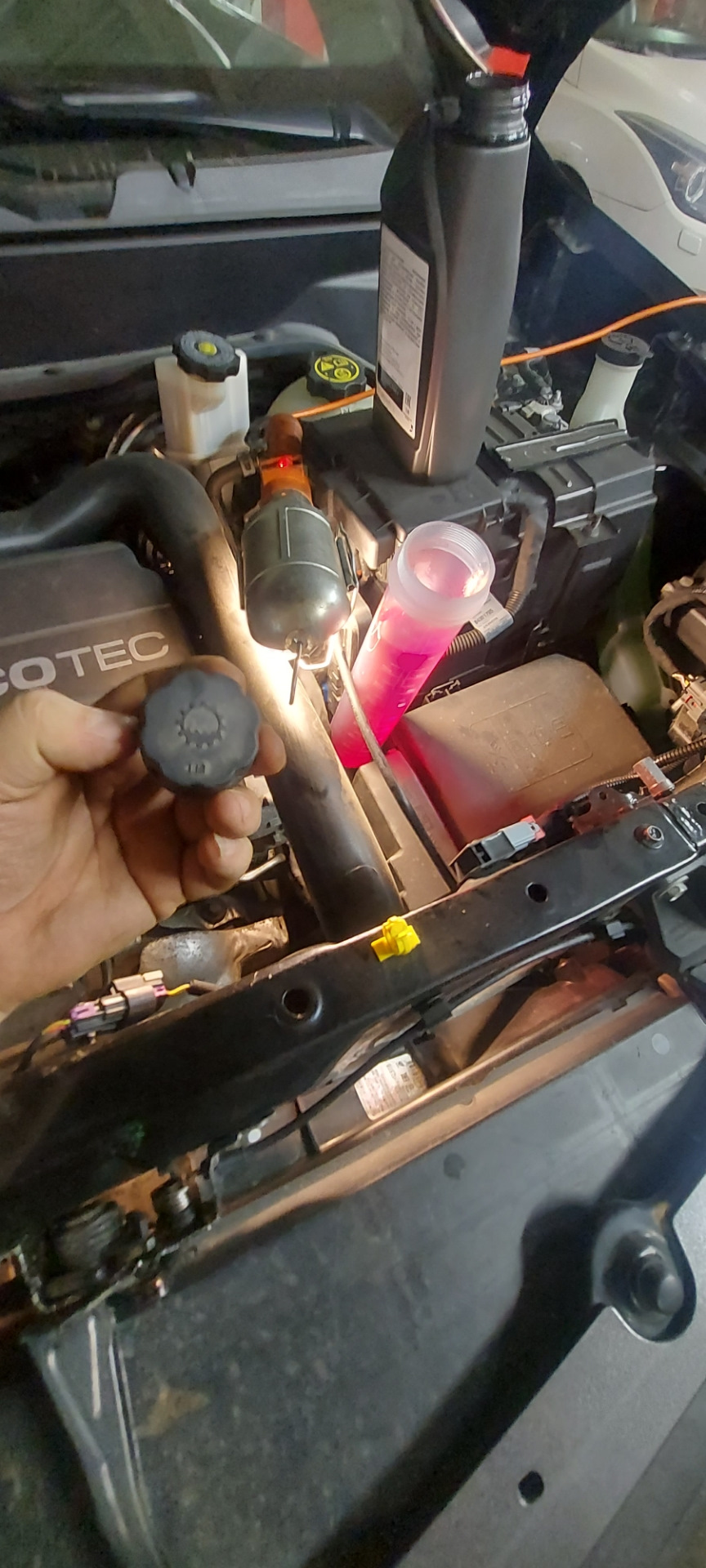 Открываем капот и находим вот такую крышку — сапун. Откручиваем руками. И вставляем воронку с трубочкой, чтоб удлинить, ну и для удобства.
