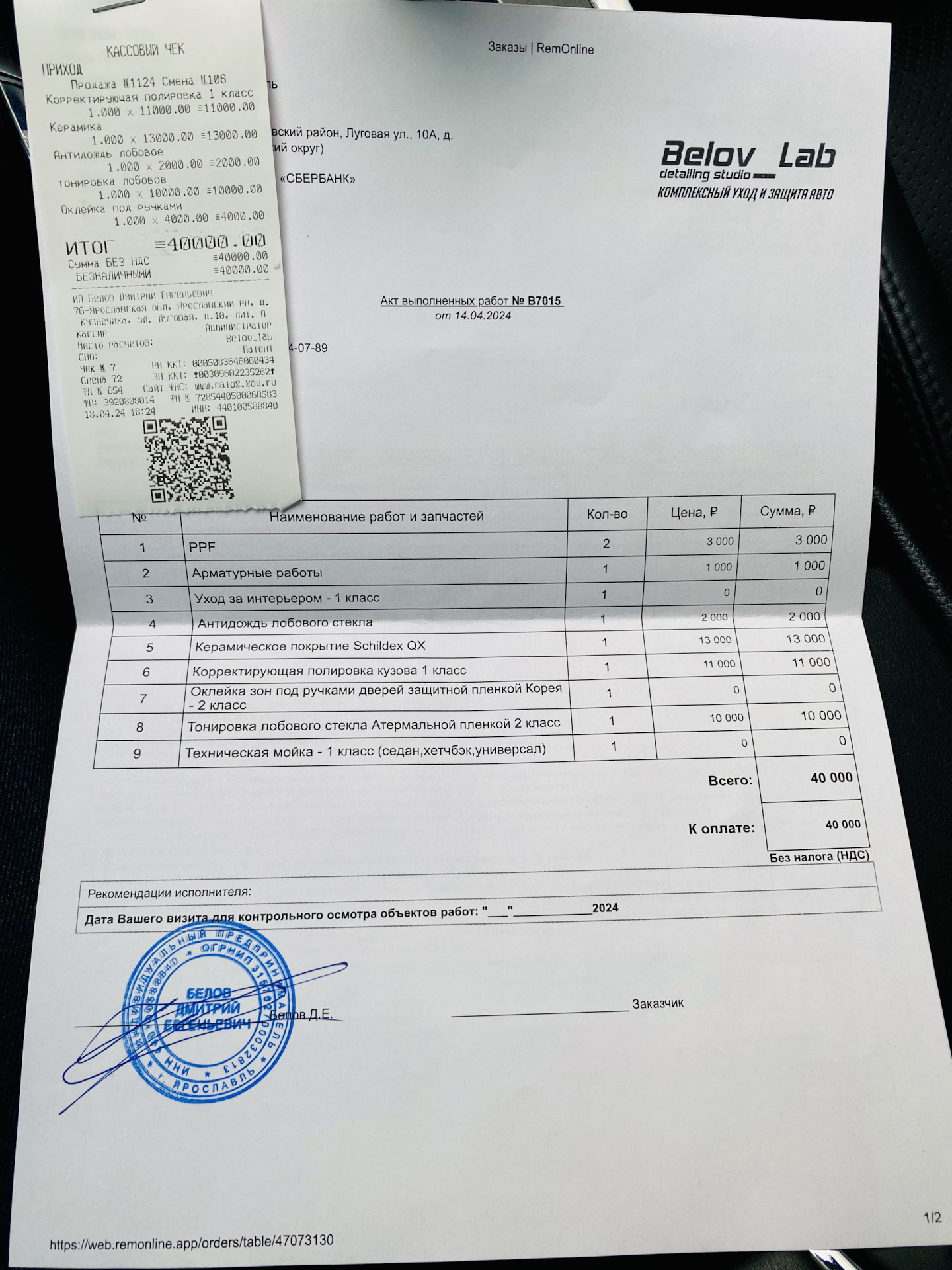 На 14 апреля я записался в детейлинг центр Belov Lab на полировку, керамику, оклейку лобового стёкла атермальной пленкой, оклейку центральной консоли кпп. Забрал машину спустя 4 дня.