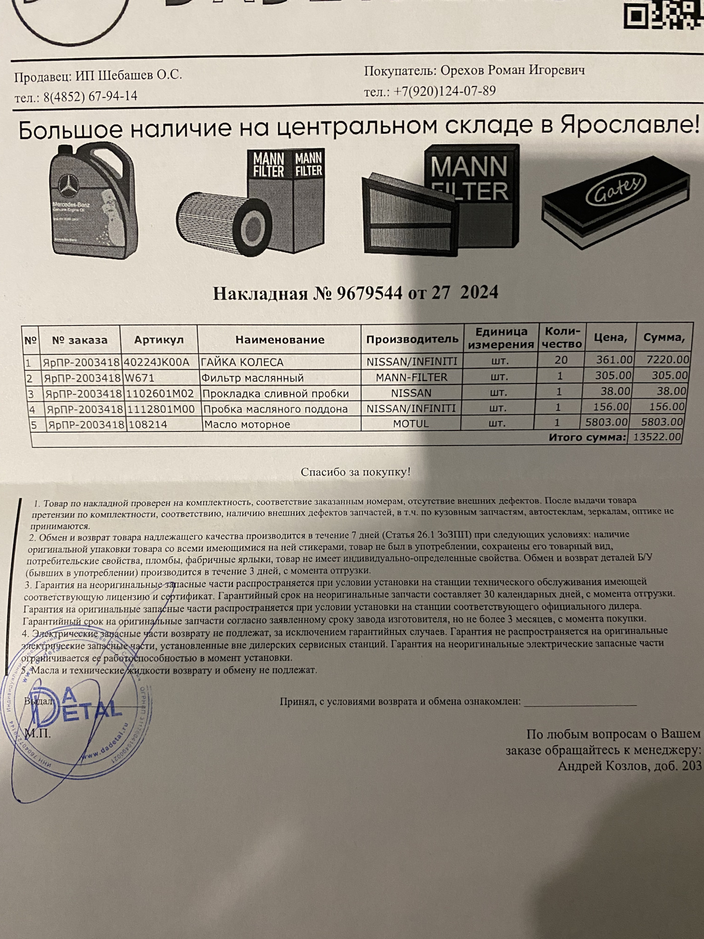 Настал момент для замены масла, с предыдущей замены накатал почти 7 тыс км, замена произошла на 171.996км. Масло так же лью Motul Eco lite 8100. Поехал заказывать масло и фильтра + понимал что скоро нужно переобуваться и пора купить новые колесные гайки, потому что в сервисах начали высказывать недовольства, мол гайки закатанные.