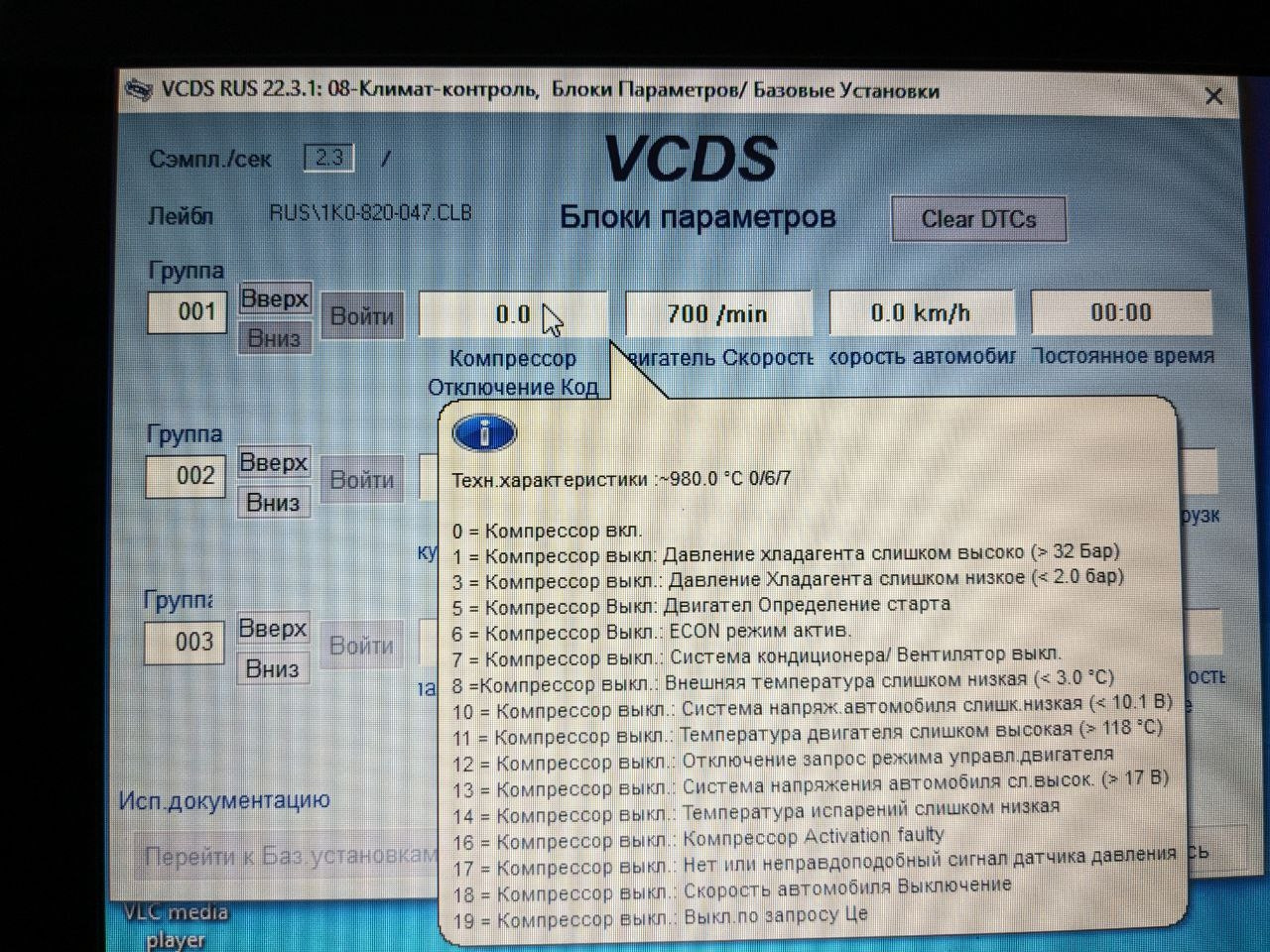 В Группе 001 у меня был код 3 — слишком низкое давление, компрессов отключен.