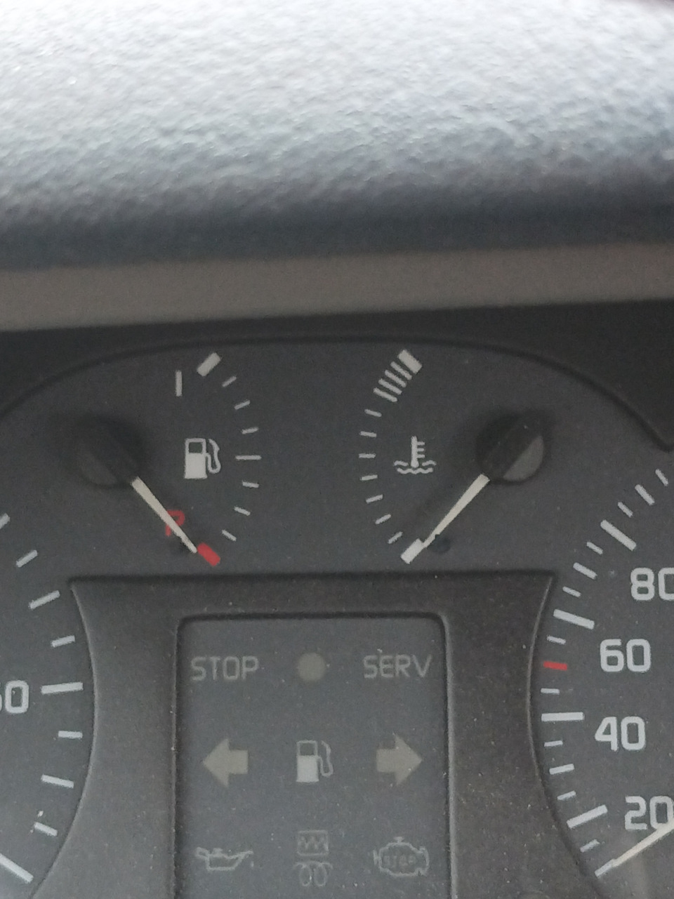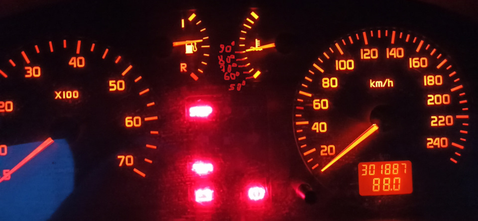 Температура посередине должна быть. Или имеется в виду время прогрева? Как обороты падают до первого деления — можно ехать. Бак на 60 л. Лампочка загорается при остатке в 70 км по БК