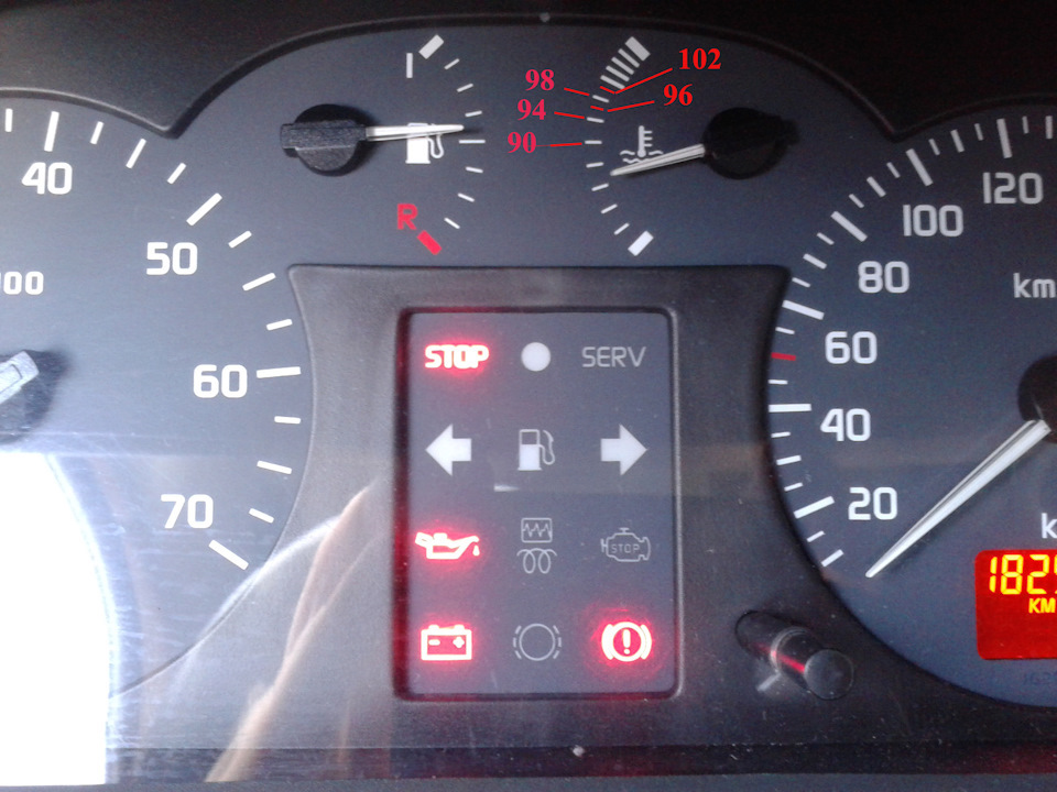 Бак 60 литров. В бортовом компьютере можно посмотреть количество топлива в литрах. Для этого на выключенном зажигании зажать кнопку БК и повернуть ключ в положение зажигание не отпуская кнопку. После этого панель перейдет в режим диагностики. Нажимаем кнопку БК и на дисплее показывается количество топлива в литрах. Очень удобно. Значение температуры не подскажу, но норма это когда стрелка лежит горизонтально.