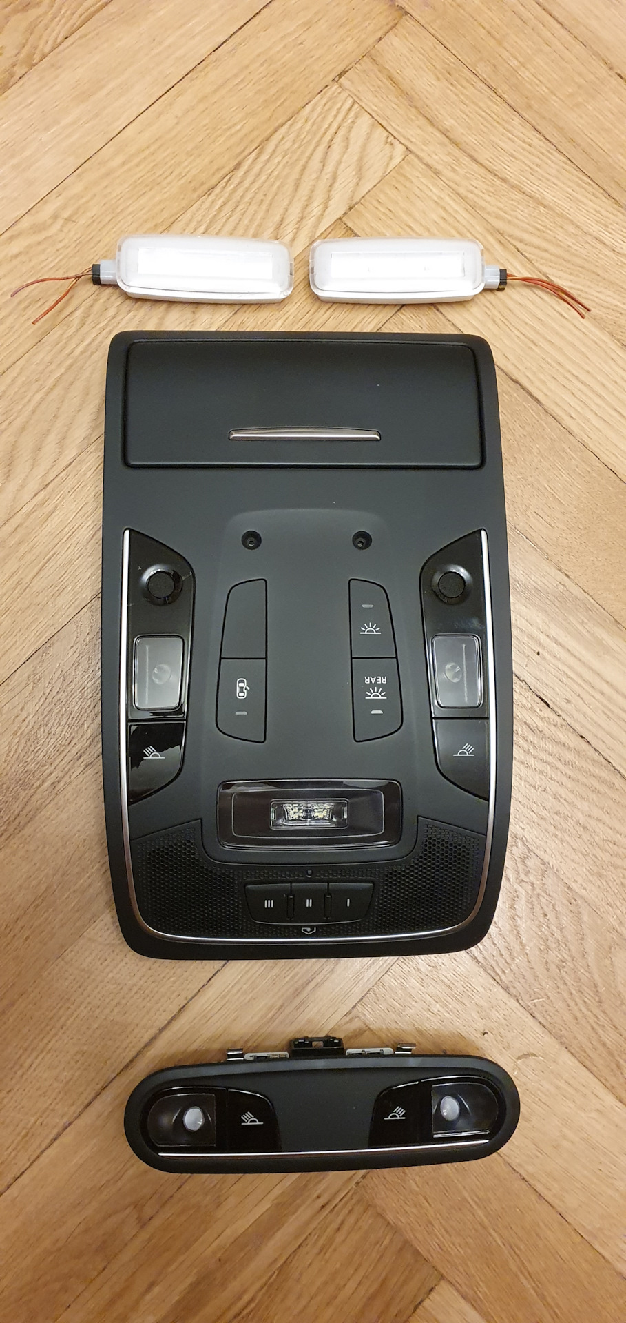 Там для панорамы две кнопки, одна для шторки, вторая для крыши. Думаю должно все работать, искать только от авантов, т.к только они были с панорамой. Вот с боковыми светильниками я пока не готов ответить, какие ставить🤷🏻♂️. Так как на А6 даже с панорамой, задний плафон целиковый!